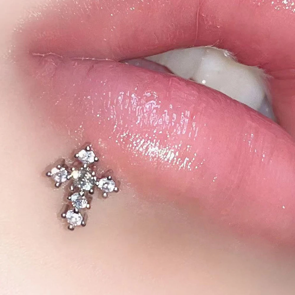 Lunivop 1pc Shiny Zircon Cross Lip Stud Stainless Steel Punk Cool Style Labret Piercing Silver Color Ear Accessories Ins Fashion Jewelry