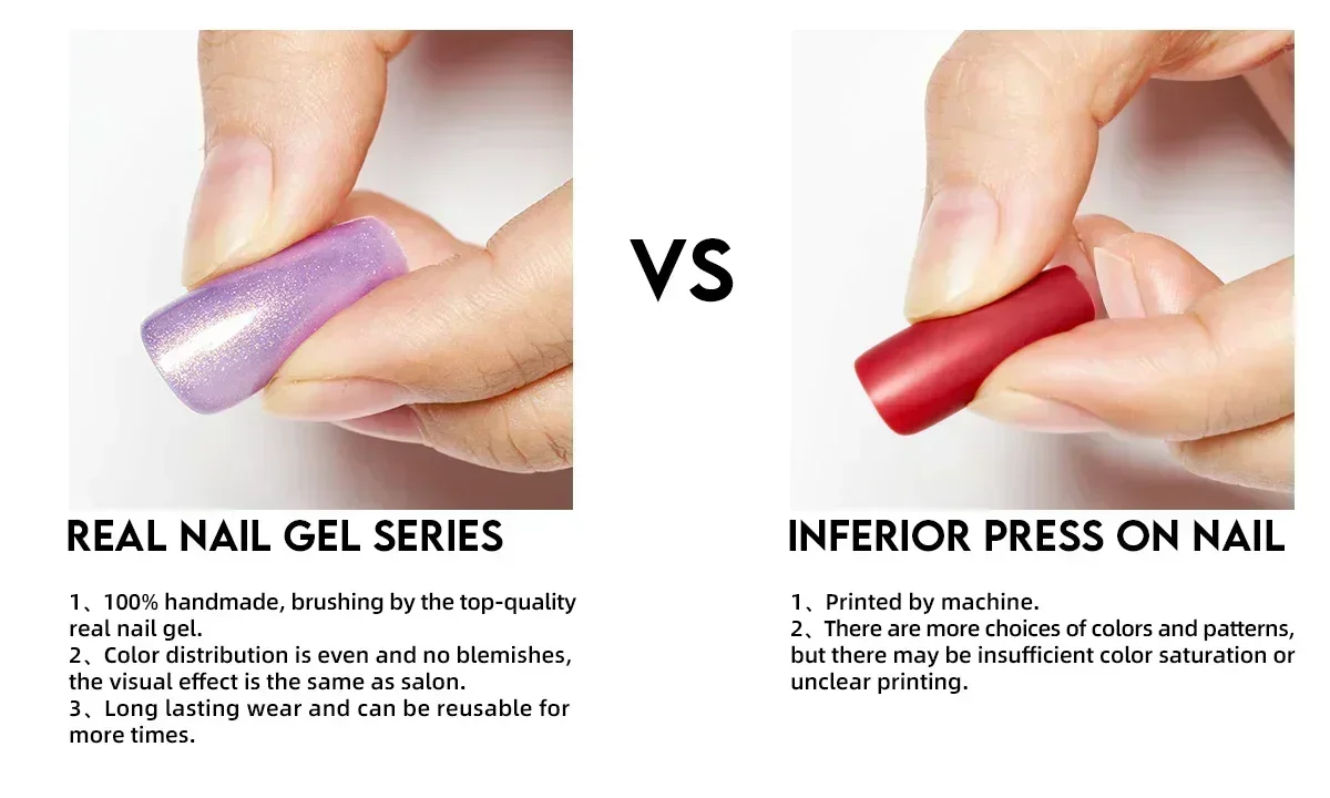 The press on nails of real nail gel are especially exquisite. They are not done by machine printing, but by the manicurists manually brushing real nail gel one by one.