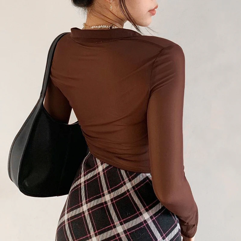 Lunivop Brown Vintage Y2K Mesh Tops Women Button Up Long Sleeve Cropped Tee Shirt See Through Sexy Rave E Girl T-Shirts Autumn блузка