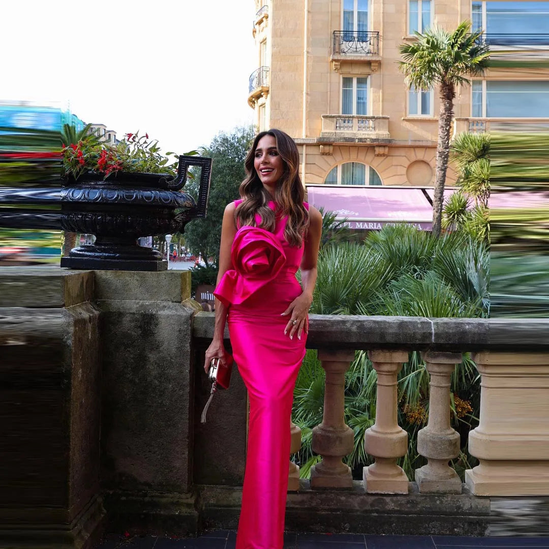 Lunivop Charming Rose Red Satin Flower Evening Dresses Elegant Sleeveless Long Prom Gowns High Quality Taffeta Formal Party Dress
