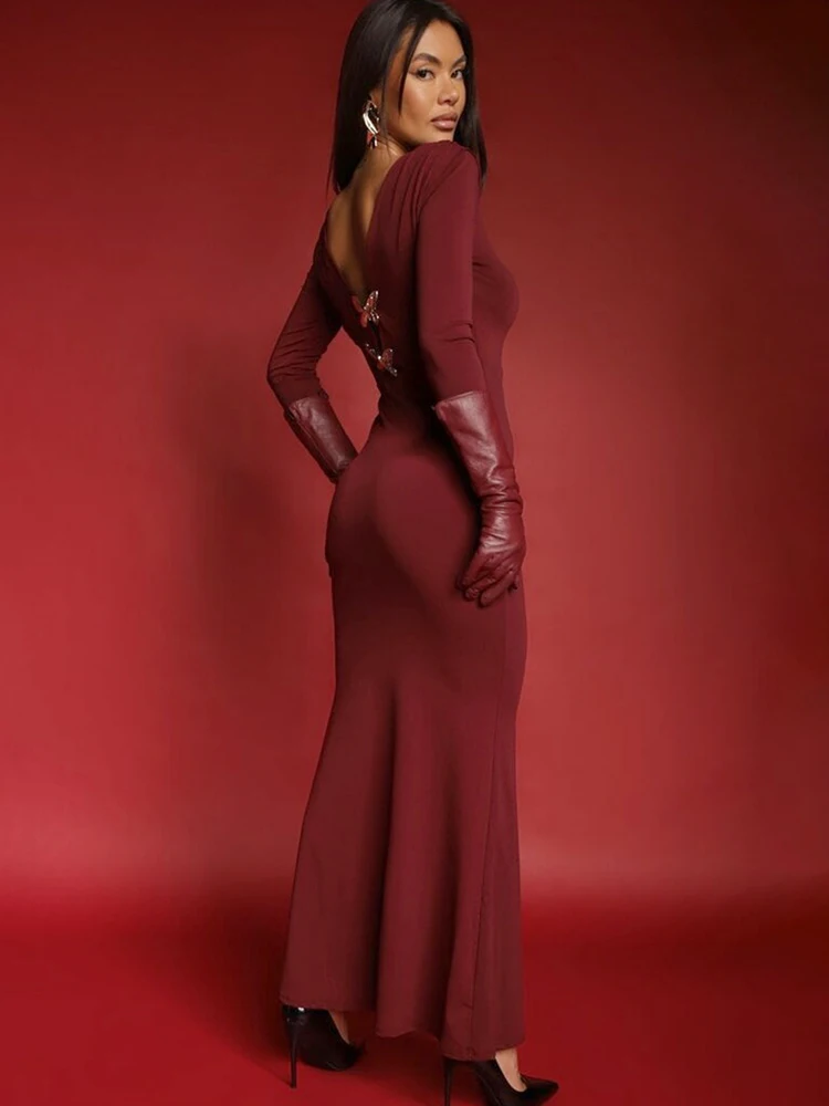 Lunivop Elegant Deep V-neck Butterfly Women Maxi Dress Black Long Sleeve Evening Dress Female Winter Slim Fashion Party Clubwear