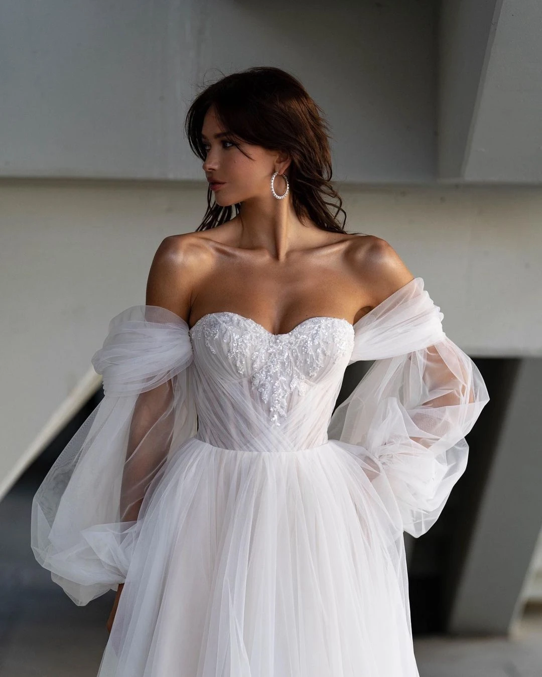 Lunivop Franch Style Romantic Women's Wedding Dress Off Shoulders Latern Sleeves Embellished A Line Bride Dresses Side Slit Bridal Gown