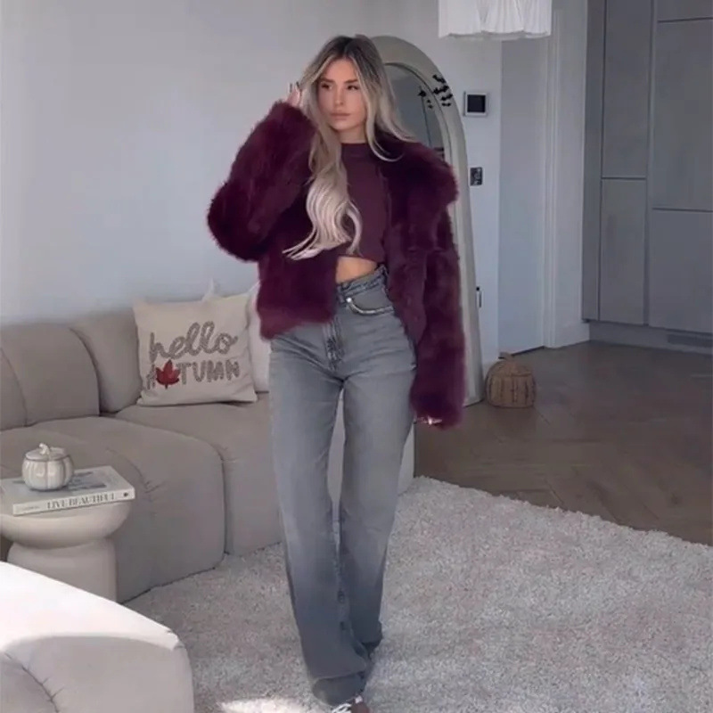 Lunivop Luxury Brown Women's Fluffy Faux Fur Warm Short Coat Chic Lapel Collar Long Sleeve Furry Jacket Winter Lady Streetwear