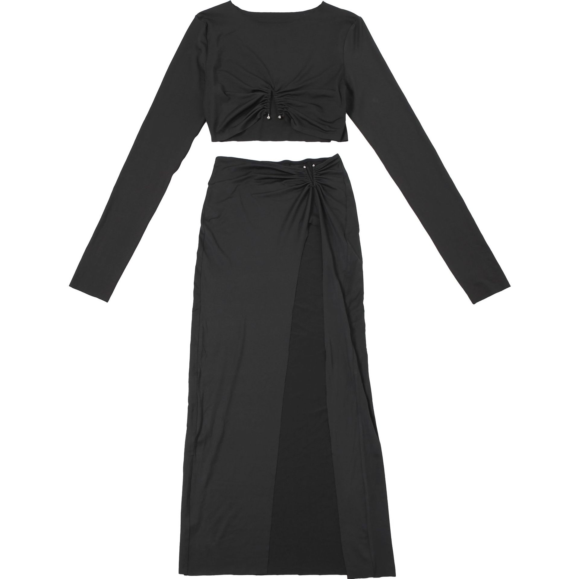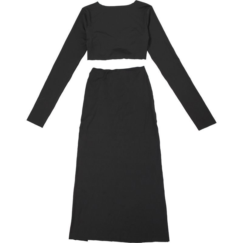 Lunivop Sexy Black 2 Piece Set Women Y2K Outfits Club Wear Fall Hardwear Detail Hollow Crop Top And Split Long Skirt
