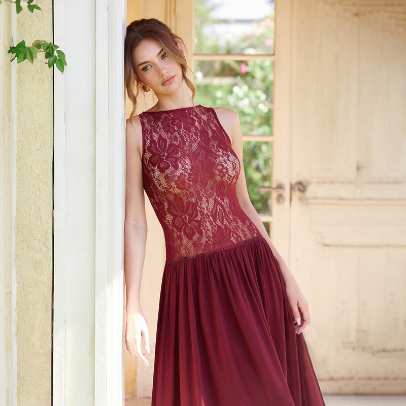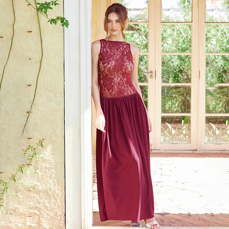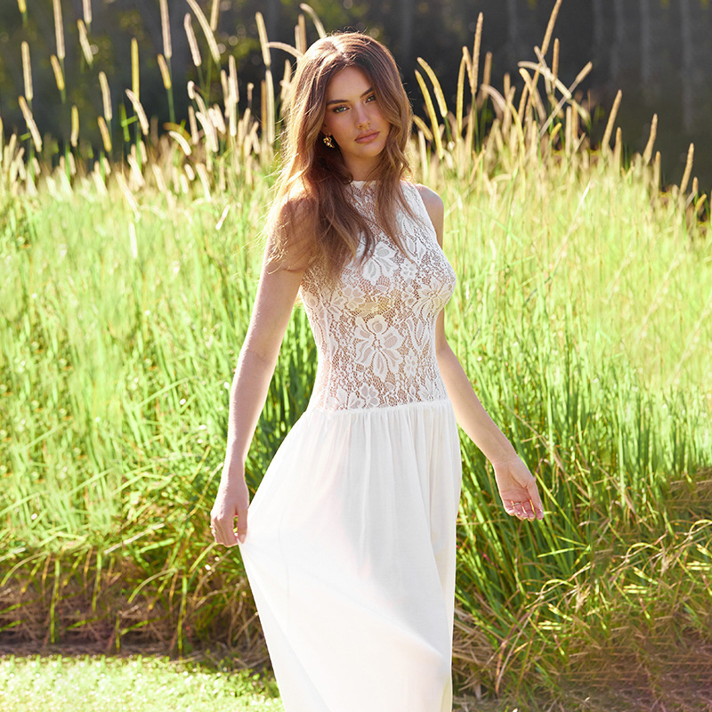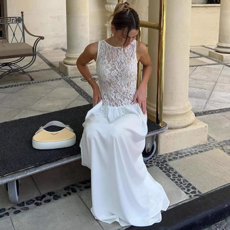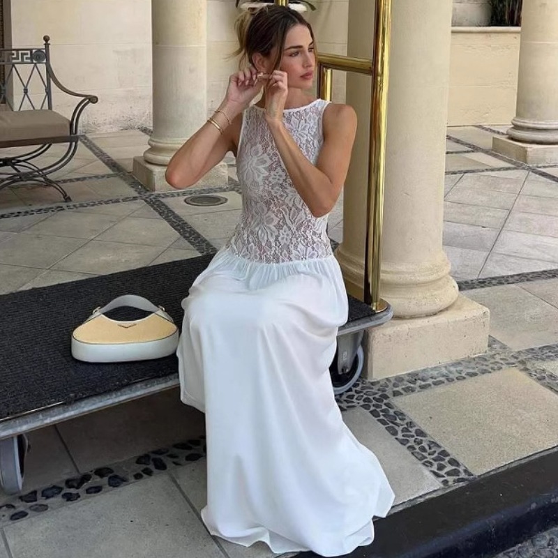 Lunivop White Lace Printed Long Dress Female See-Through Sleeveless Patchwork Elegant Party Dress Gown Women Maxi Dresses