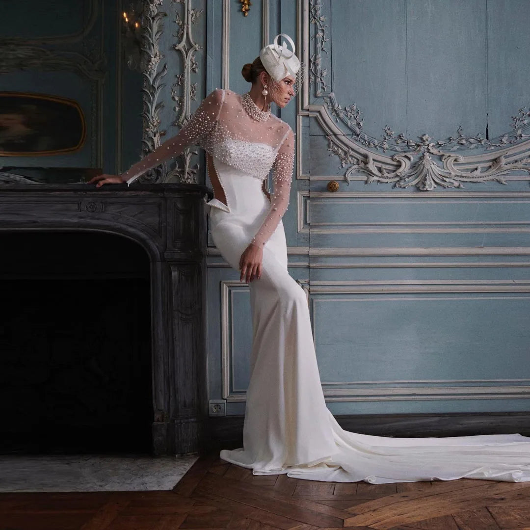 Lunivop High O-neck Pearls Long Sleeve Mermaid Dress Floor Length See Through Women White Bridal Satin Dresses Custom Made Wedding Gown