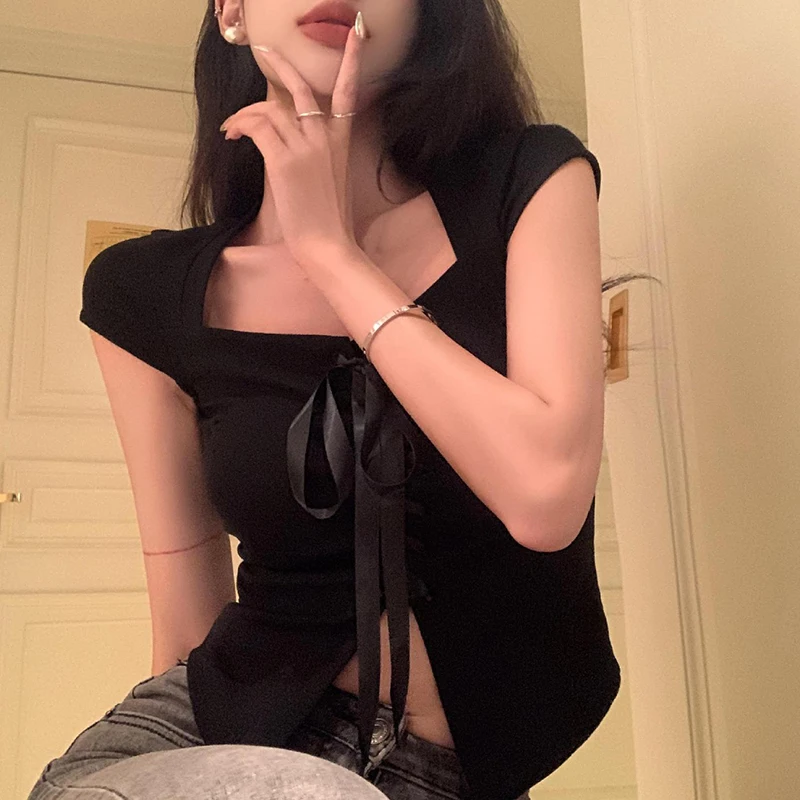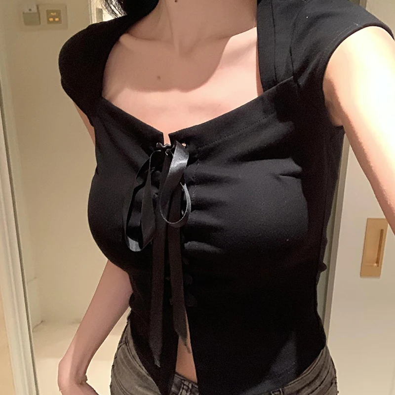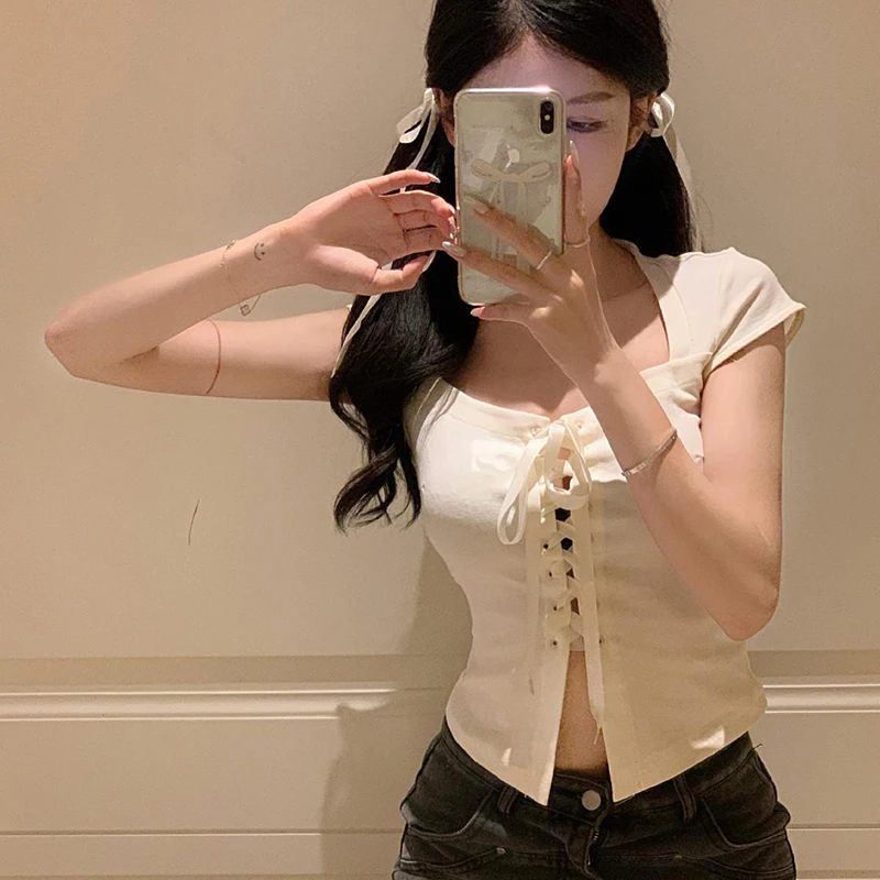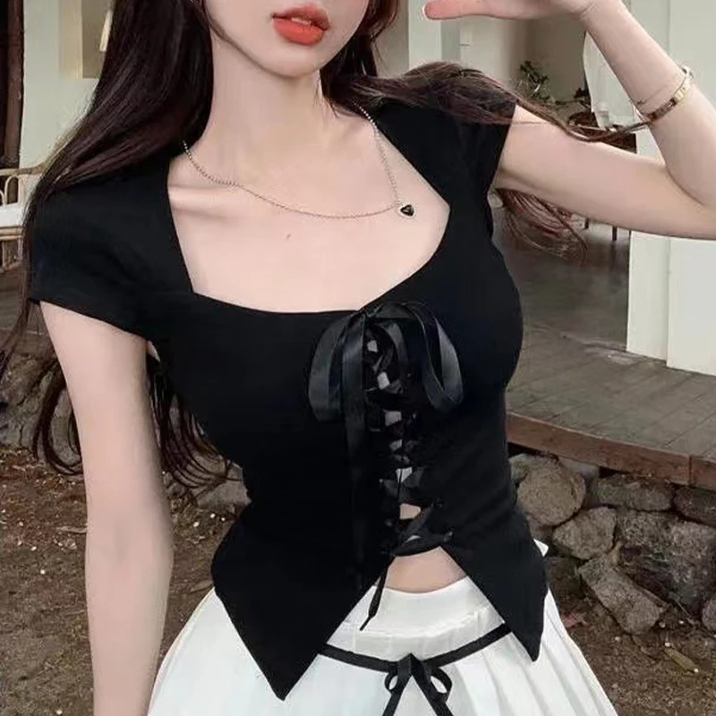 Lunivop High Street Korean Fashion T-Shirts Cross Bandage Design Gyaru Square Collar Crop Top Short Sleeve Daily Grunge Tees Clubwear
