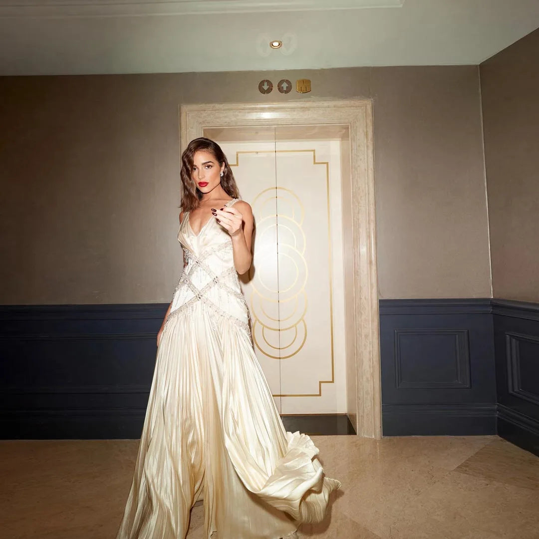 Lunivop Light Champagne Satin Long Evening Dresses Elegant V Neck Pleated Draped Prom Dressing Gowns With Tassels Sleeveless Party Dress