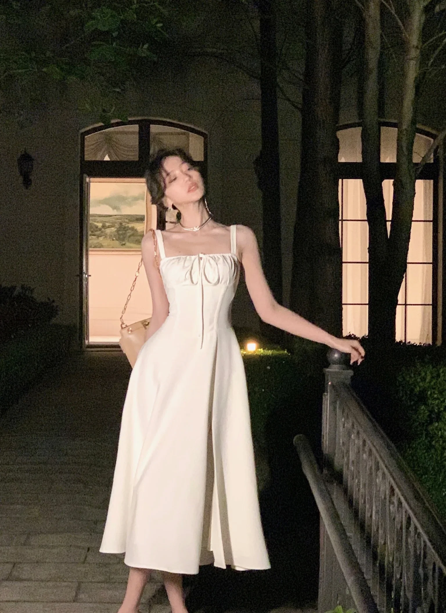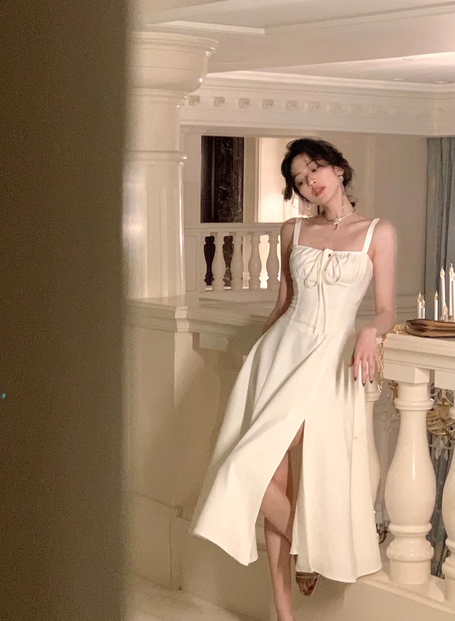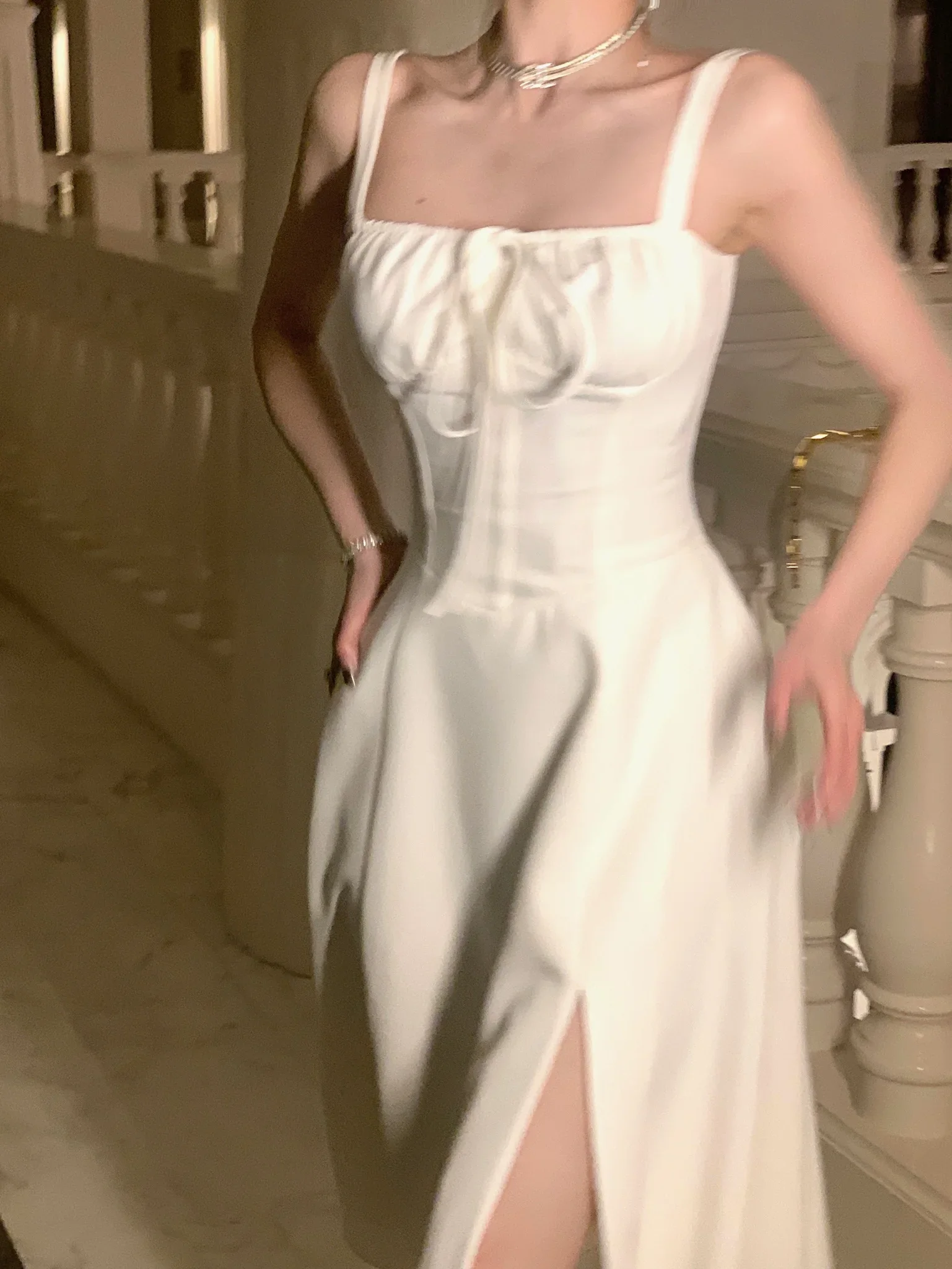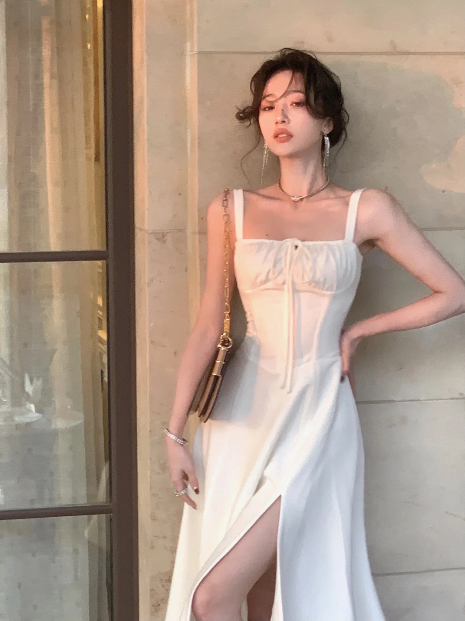 Lunivop 2024 New White Vintage Split Slip Dress Sleeveless A-line Elegant Bohemian Sexy Fishbone Bandage Dresses Female Summer Backless