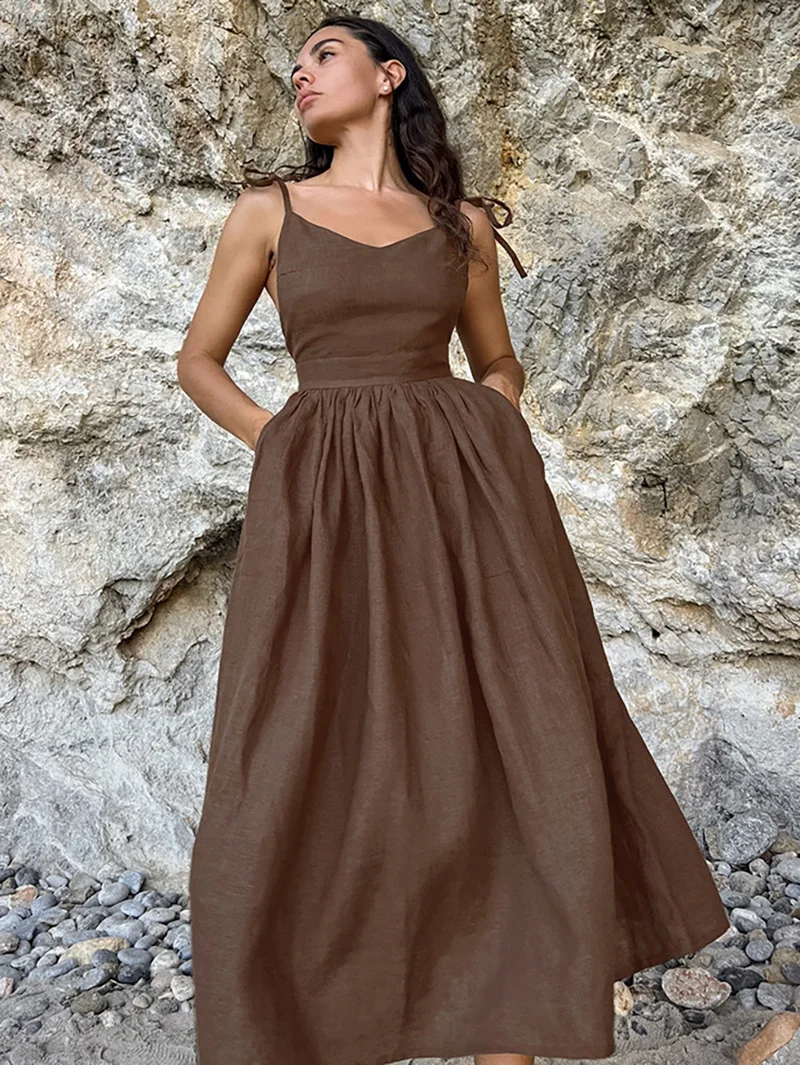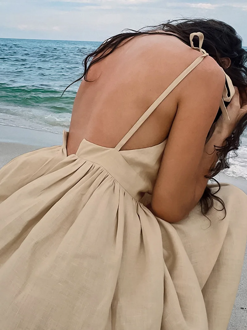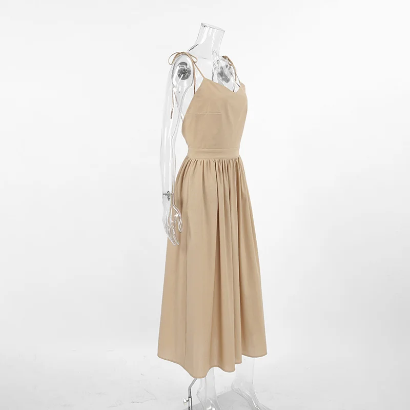 Lunivop 2024 Spring Summer Women Holiday Dress Solid Backless V-neck A-Line Flare Midi Spaghetti Dress For Women