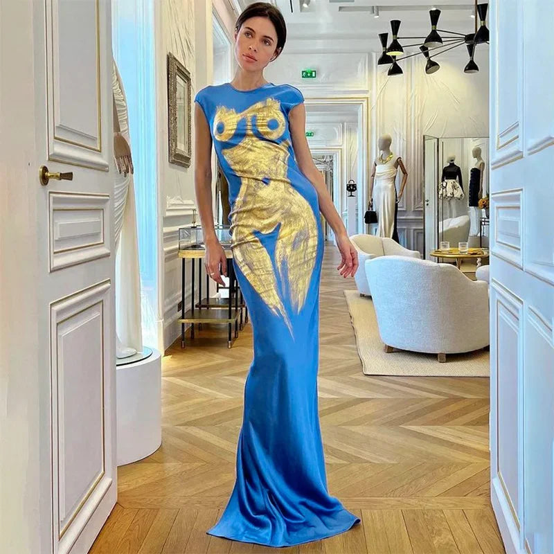 Lunivop 3D Body Print Slim Maxi Party Dress Women Autumn O Neck Short Sleeves High Waist Hips Wrapped Evening Dresses Streetwear