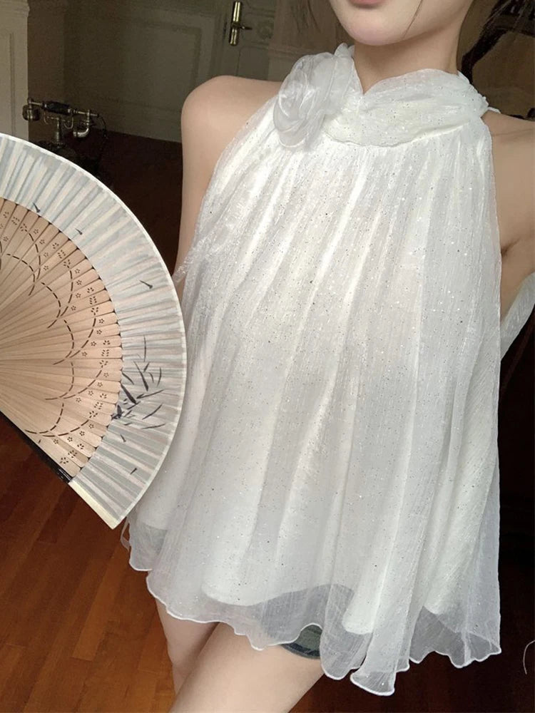 Lunivop 3D Floral White Mesh Tanks Women Loose Elegant Sweet Halter Tanks Casual Fashion Female Summer Korean Sleeveless Chic Tops