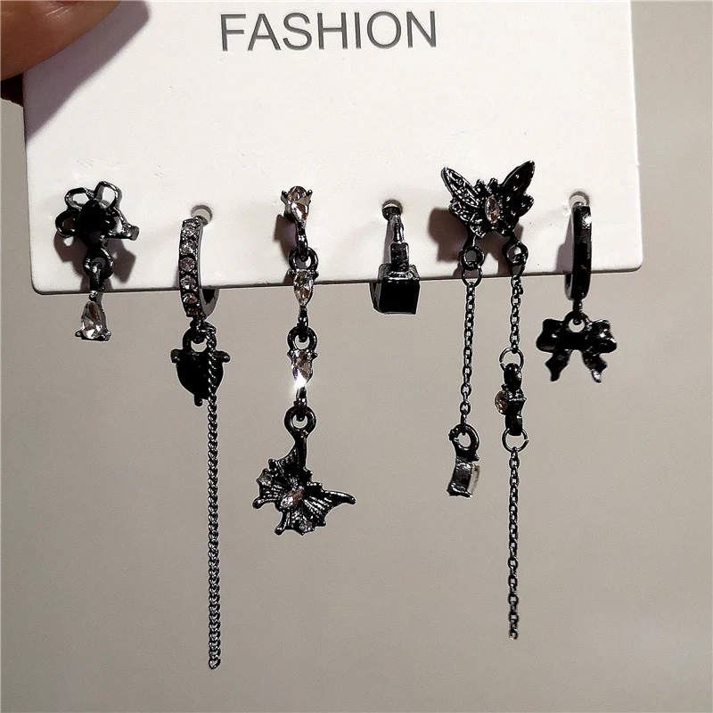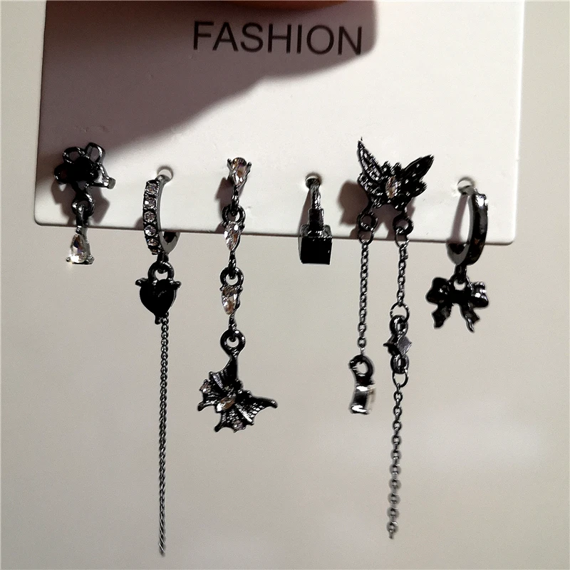 Lunivop 6PCS SET Goth Black Butterfly Crystal Tassel Chain Pendant Earring For Women Vintage Aesthetic Trendy Y2K Jewelry Gift Brincos