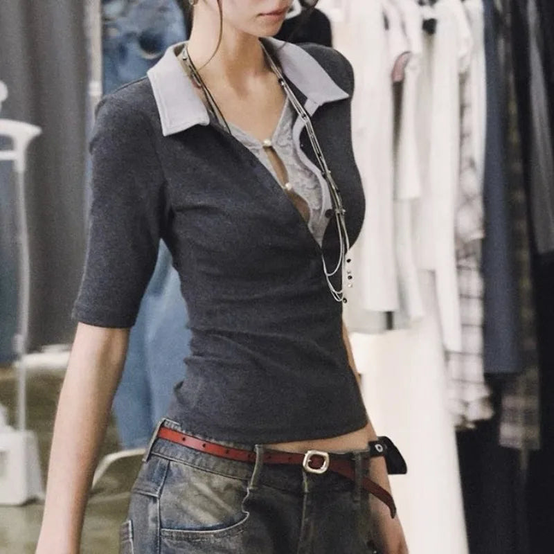 Lunivop American Retro Fake Two Piece Patchwork Blouses 2025 Summer Lapel Neck Shirts Women Y2k Slim Fit Short Sleeve Blusas Mujer