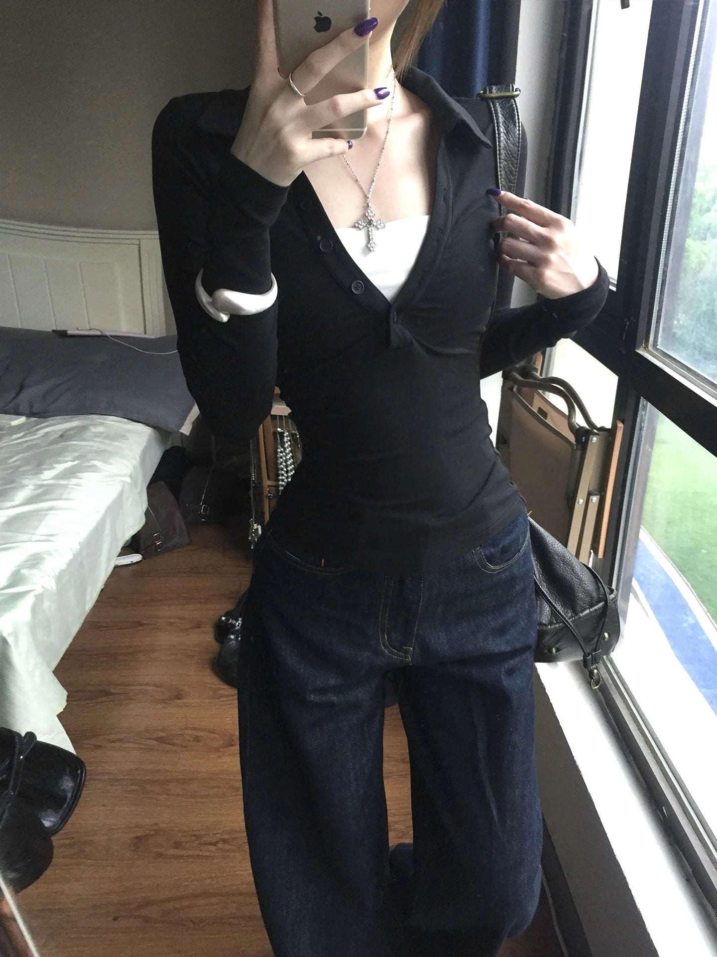 Lunivop American Retro Fake Two Pieces Tops Long Sleeve Skinny Y2k Japanese T-shirt Women Autumn 2000s Grunge Tops Tee E-girls