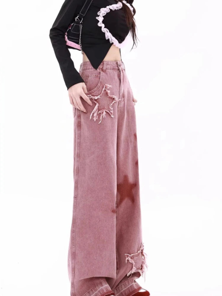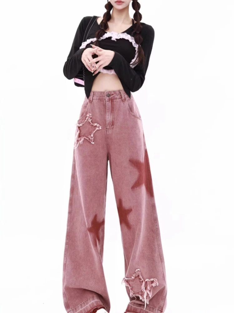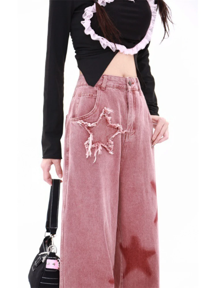 Lunivop American Retro Pink Star Cargo Jeans Women Y2K Streetwear Harajuku Straight Leg Jeans Loose Slim Wide Leg Casual Denim Pants New