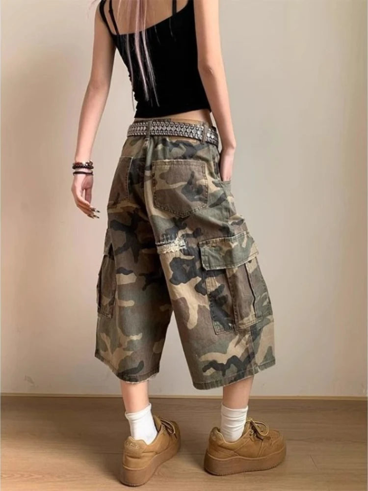 Lunivop American Vintage Hole Camouflage Shorts 2025 Summer Casual Calf- Length Pants Straight Loose Wide Leg Jeans for Women