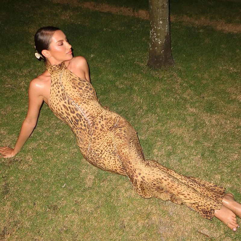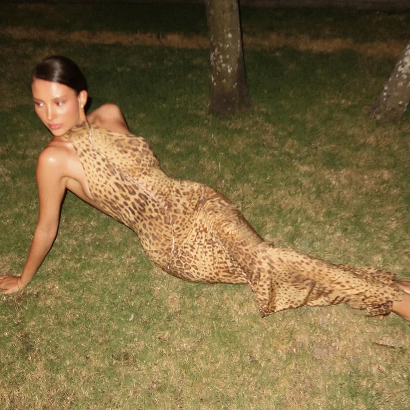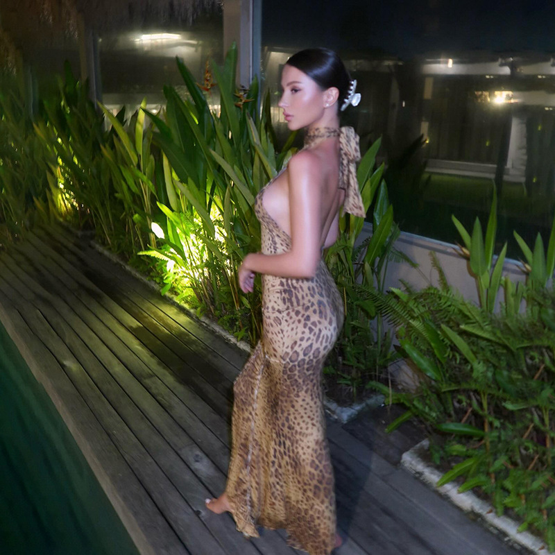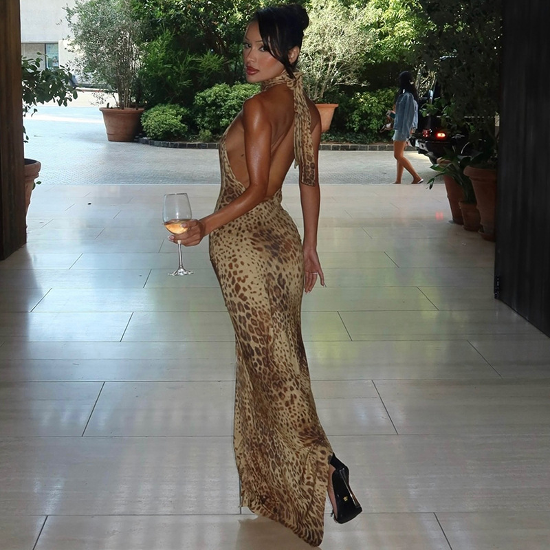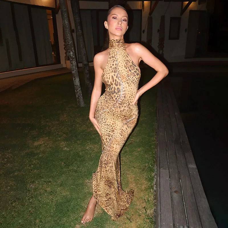 Lunivop Asymmetrical Leopard Print Summer Dresses For Women Sexy Club Outfits Hollow Out Bandage Halter Backless Long Dress