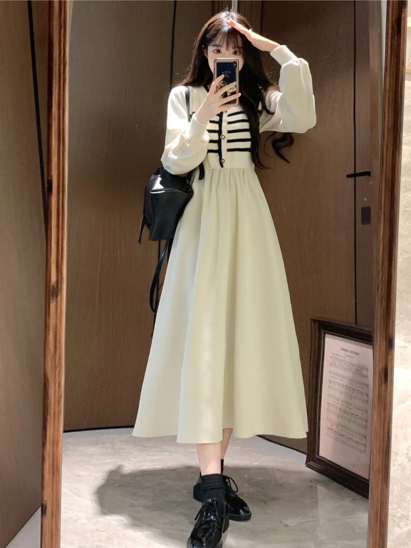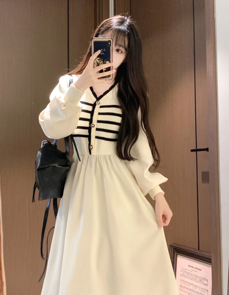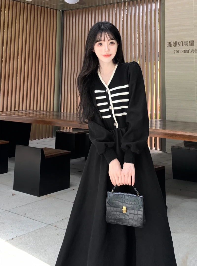 Lunivop Autumn and Winter Korean New Version of the Fashion V-neck Large Size Midi Fake Two-piece Knitted Splicing Loose Skinny Dresses
