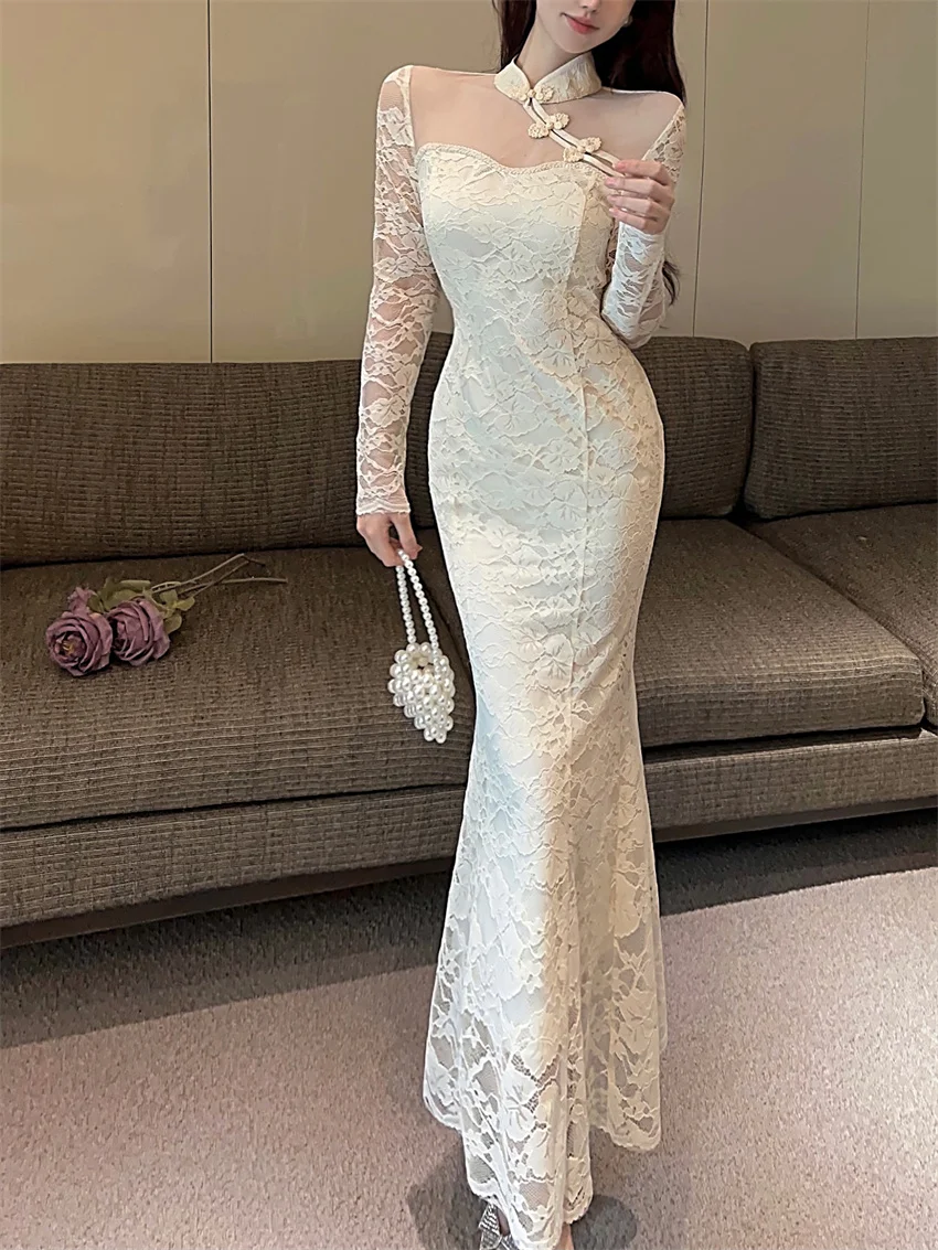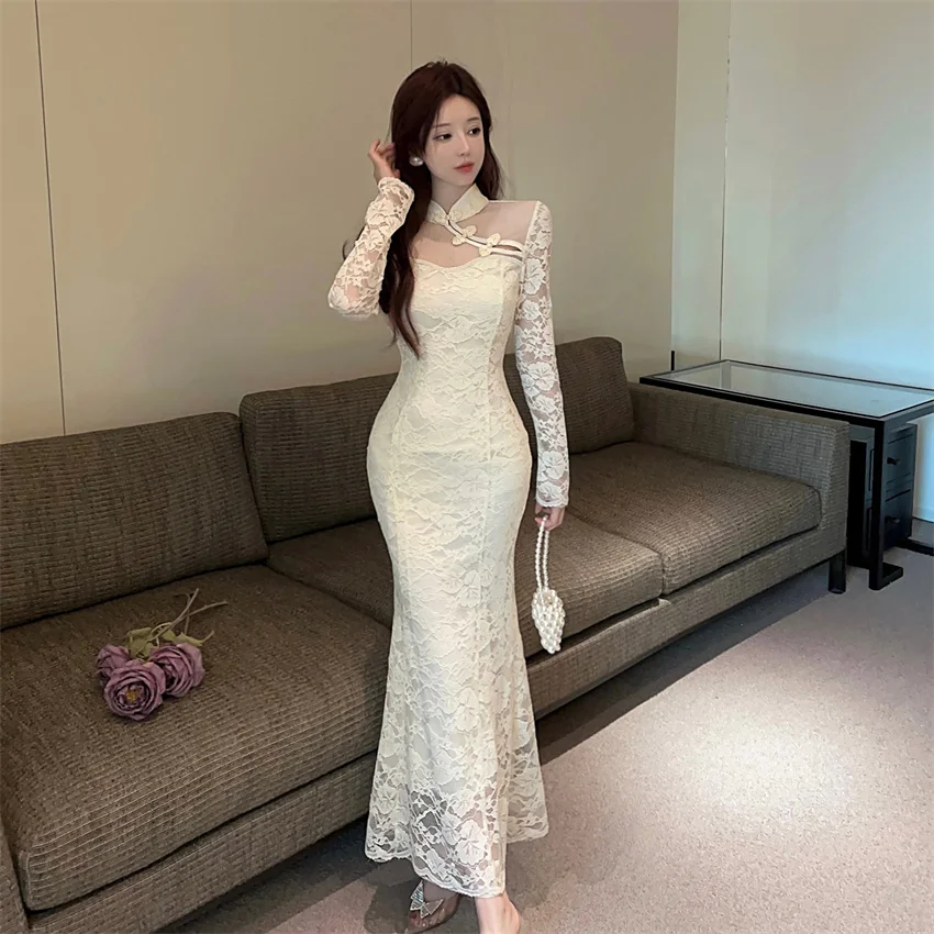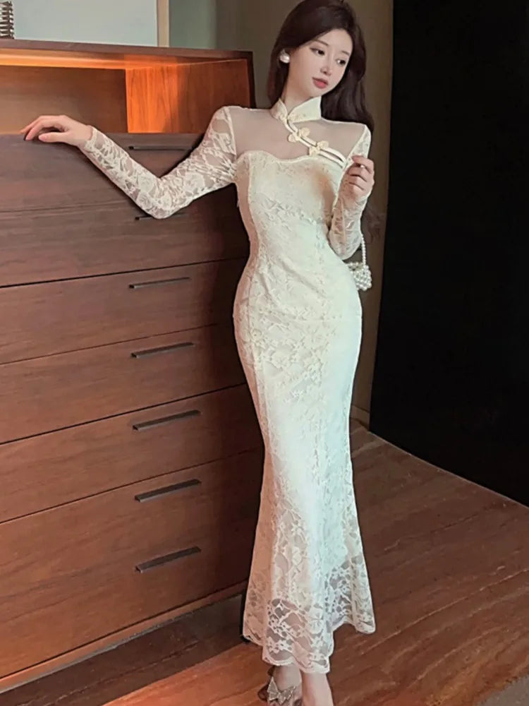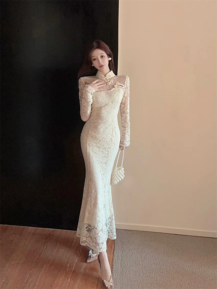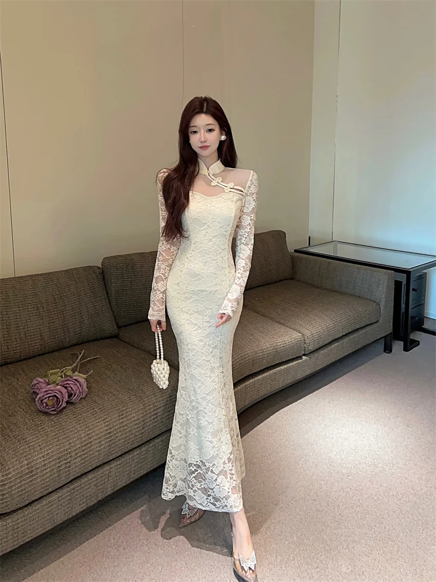 Autumn Elegant Cheongsam Dress for Women Sexy Solid Stand Collar Long Sleevs Evening Party Prom Dresses Female One Piece Vestido