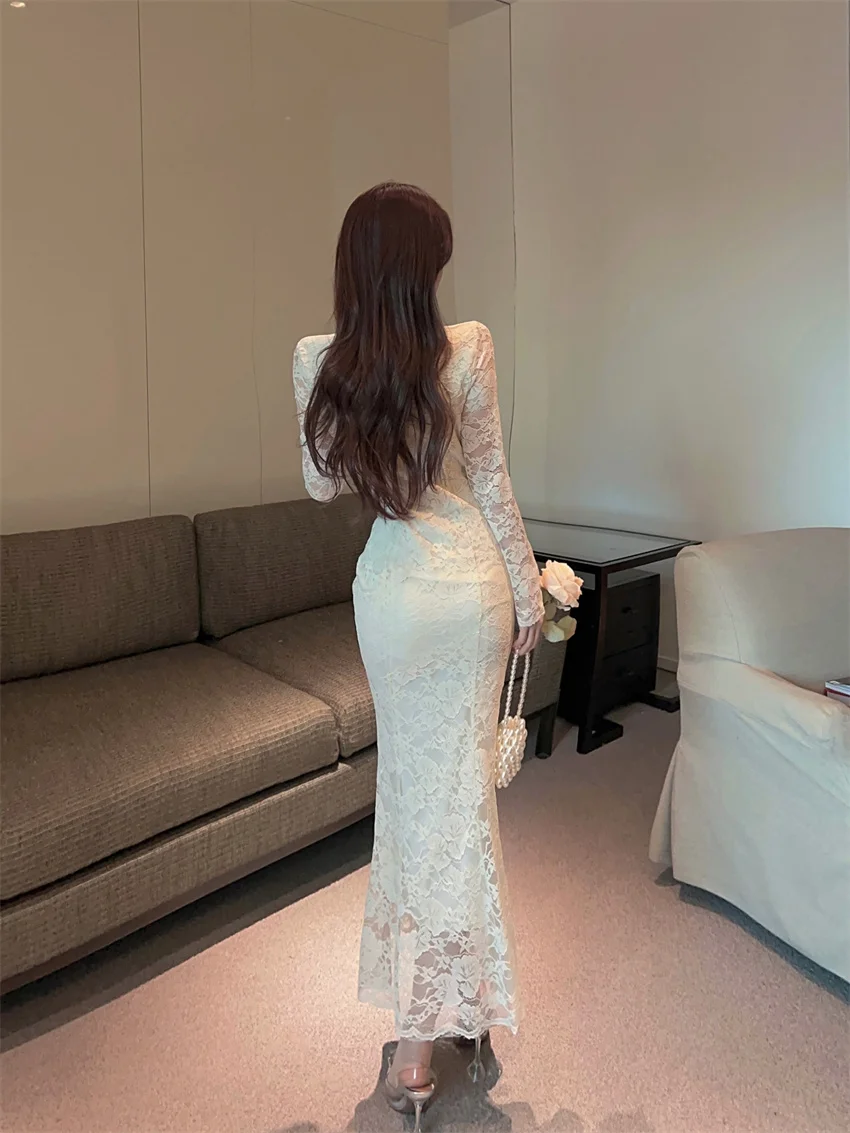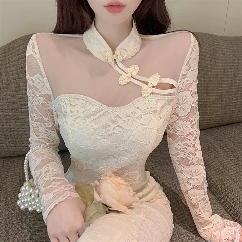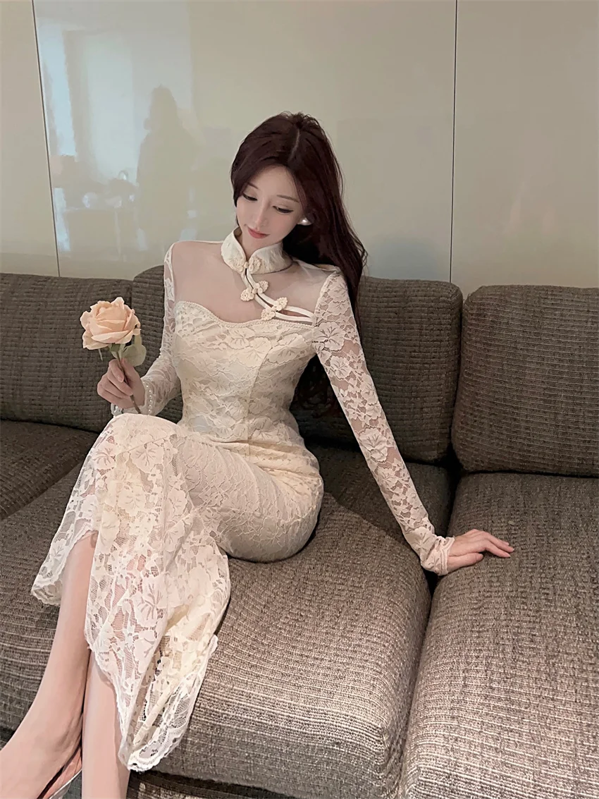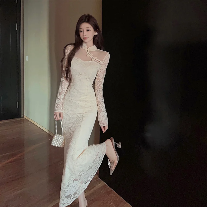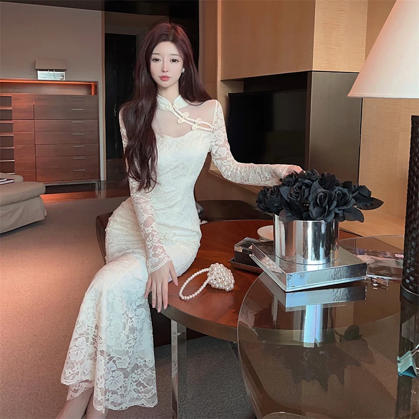 Autumn Elegant Cheongsam Dress for Women Sexy Solid Stand Collar Long Sleevs Evening Party Prom Dresses Female One Piece Vestido