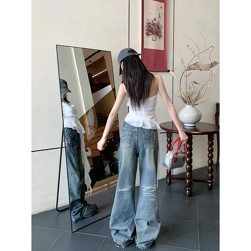 Lunivop Autumn Jeans for Women Vintage Spliced Casual Straight Loose Denim Pants 2024 New Streetwear Fashion High Waist Wide Leg Jeans
