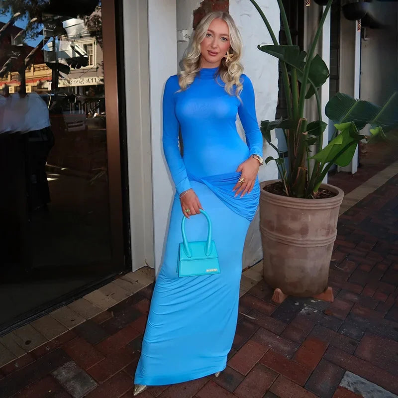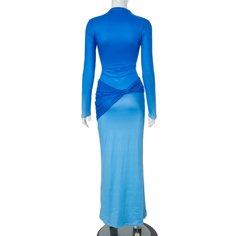 Lunivop Autumn Winter Maxi Dress Women Fashion Blue Gradient Long Sleeve Slim Dress Elegant Turtleneck Evening Party Dresses 2024