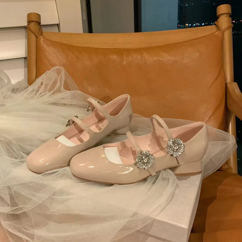 Lunivop Autumn Women Fashion Shiny Flower Double Buckle Mary Janes Shoes Patent Leather Dress Square Head Mid Heel Women's Shoes