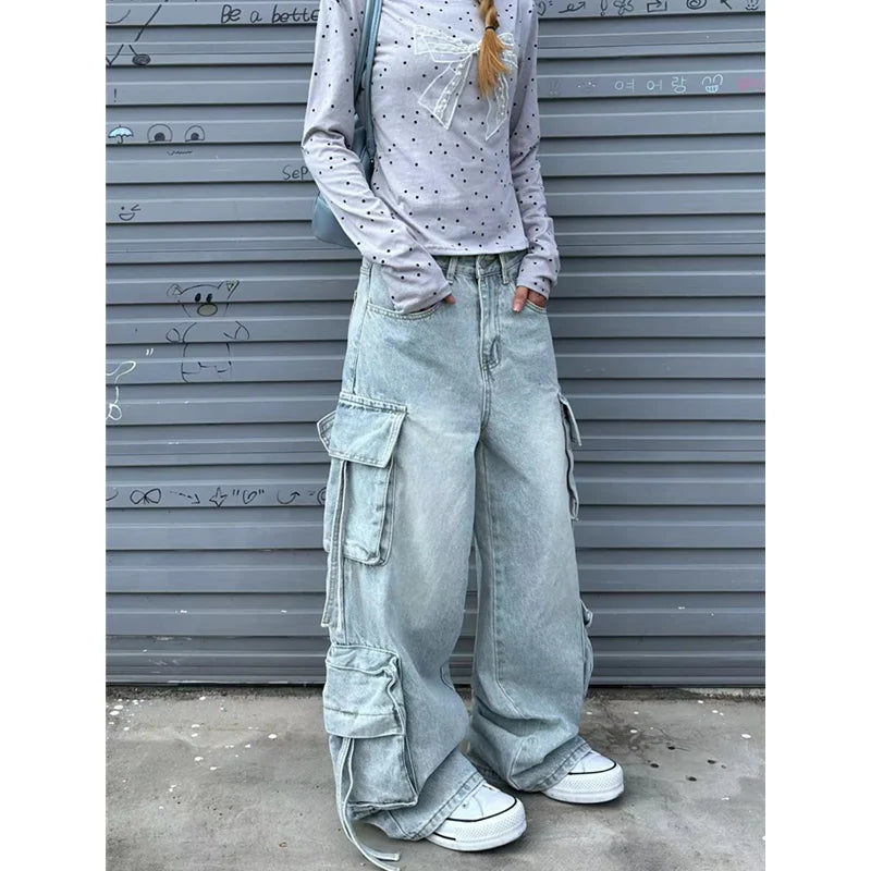 Lunivop Autumn Women's Casual Blue Harajuku Jeans Vintage Washed Aesthetic Loose Pants Y2K Wide Leg Punk Baggy Denim Trouser