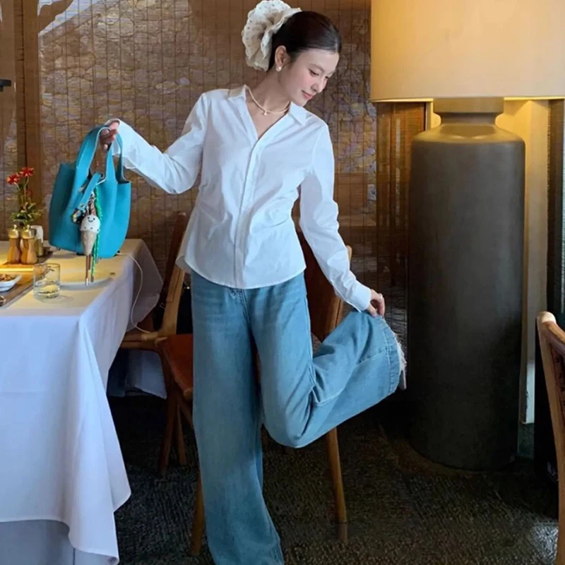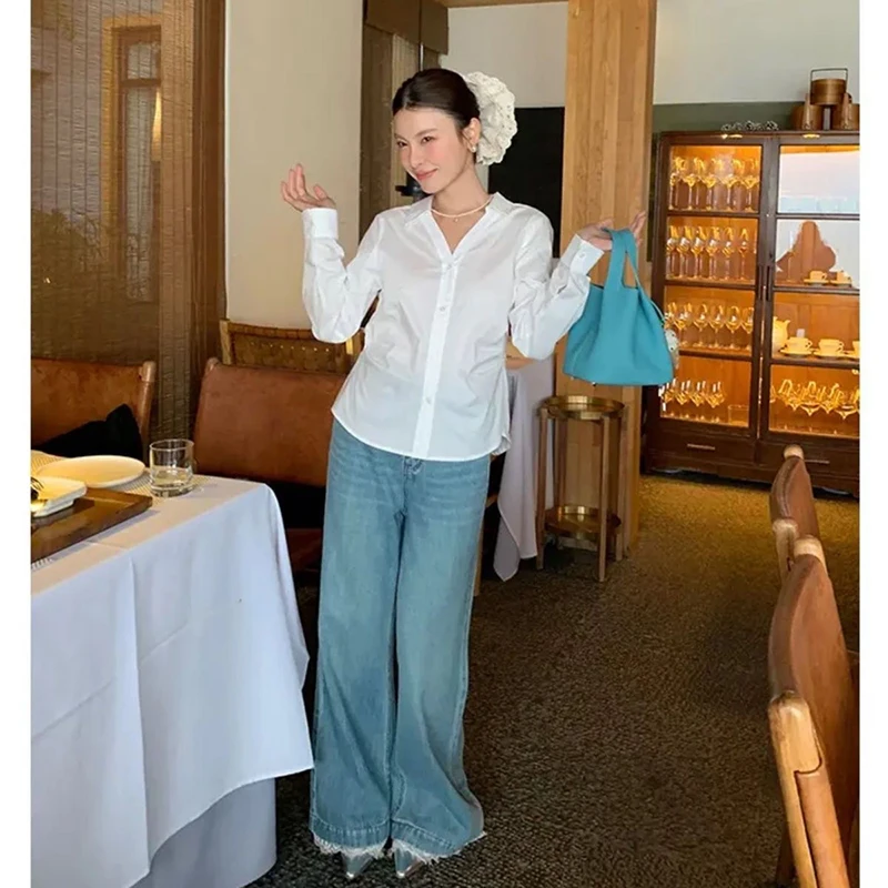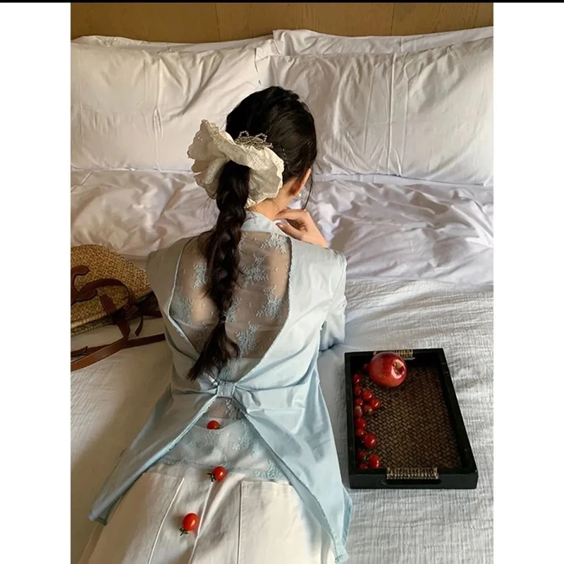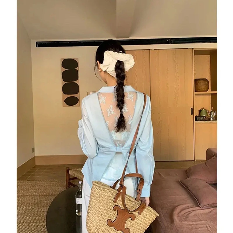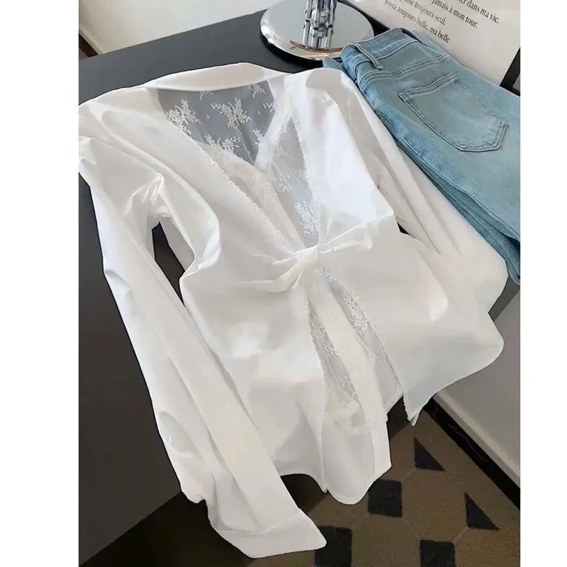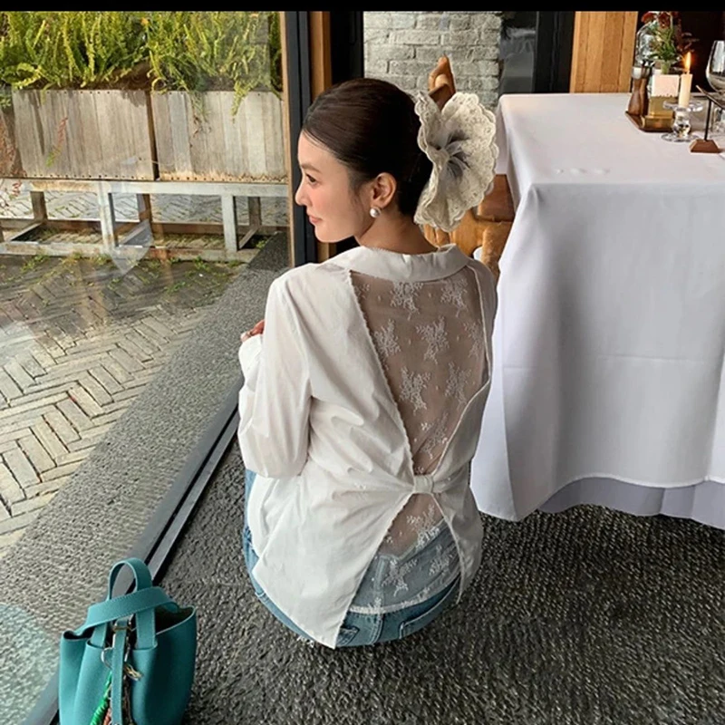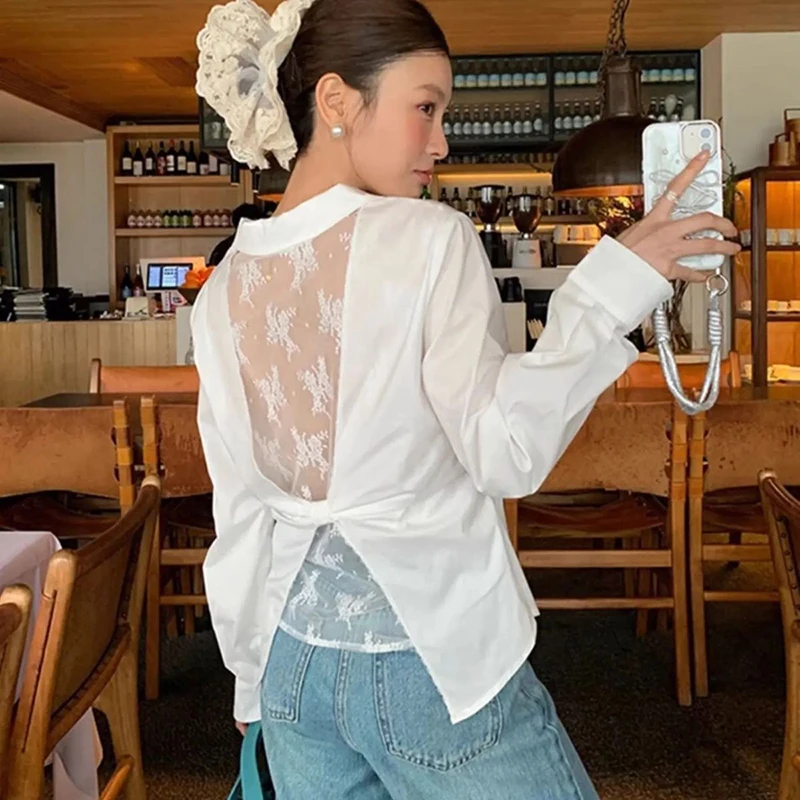 Lunivop Back Lace Hollow Out Shirt Women Elegant Fashion Long Sleeve Design Blouse Korean Sweet Slim Sexy Patchwork Lady White Tops