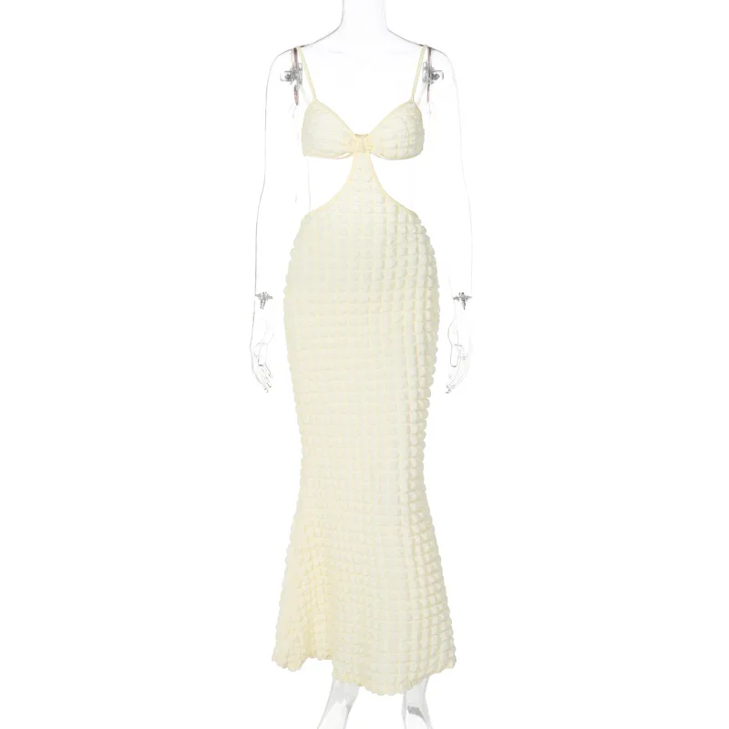 Lunivop Backless Hollow Out Maxi Prom Dress For Women Elegant Popcorn Texture Knitted Bubble Waffle Spaghetti Straps Bodycon Party Dress