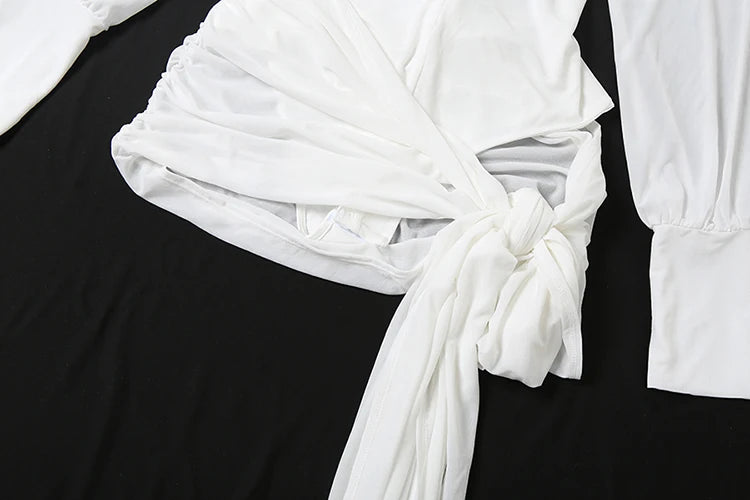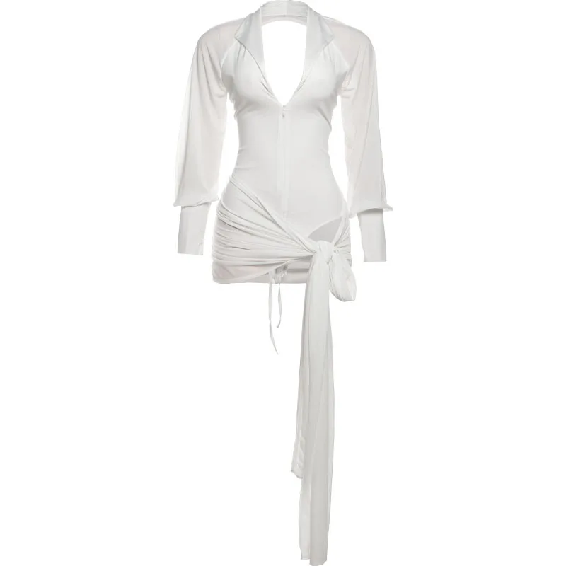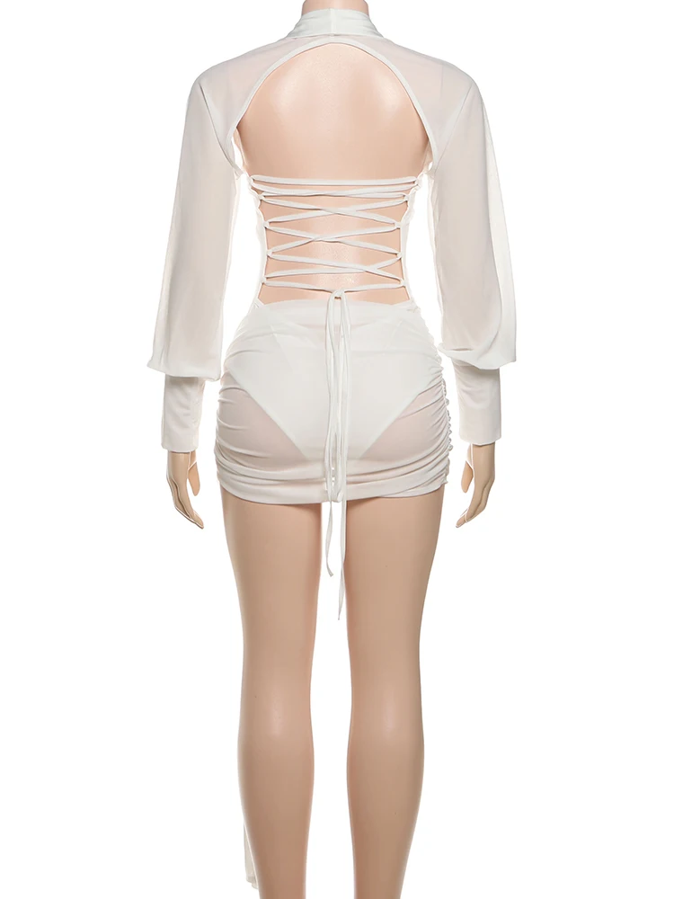 Lunivop Backless Sexy Dress Women Polo-Neck See Through Full Sleeve Ruched Kink Ribbon Midnight Club Party Solid Mini Bodycon
