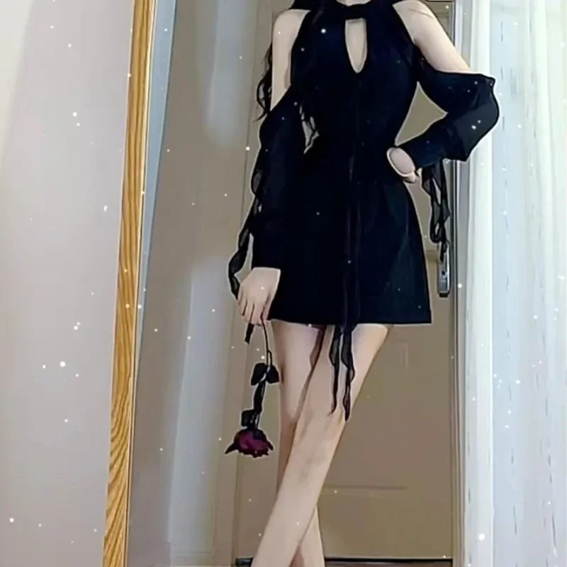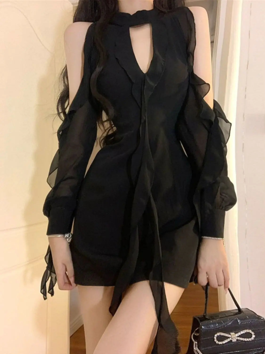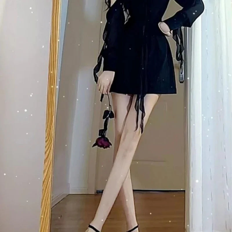 Lunivop Black Sexy Chiffon Dress Women Elegant Ruffle Mesh Mini One-piece Dress Fairycore Sweet Luxury Bodycon Korean Style