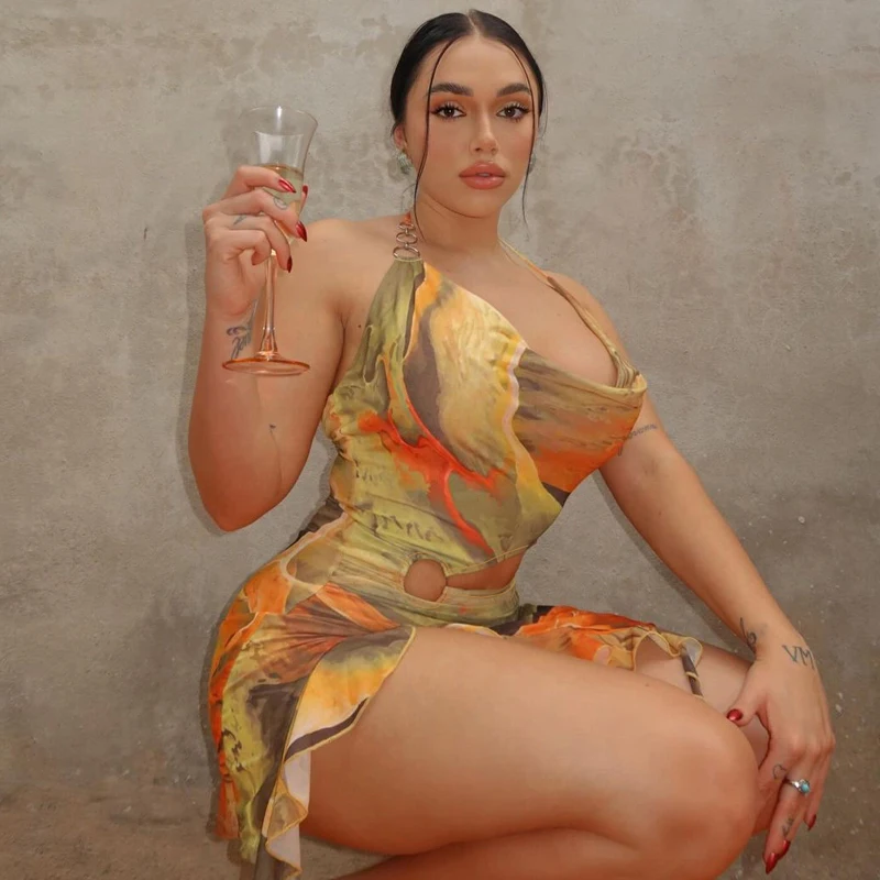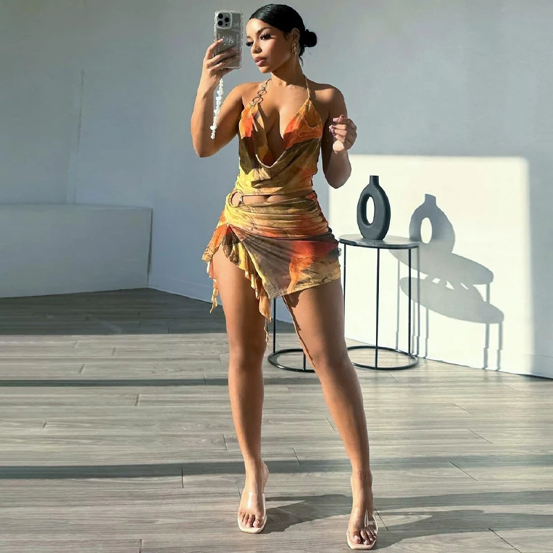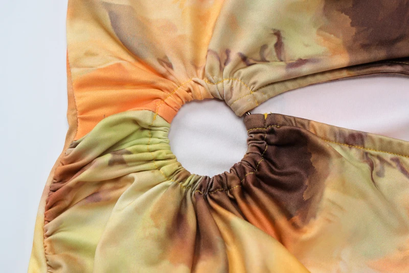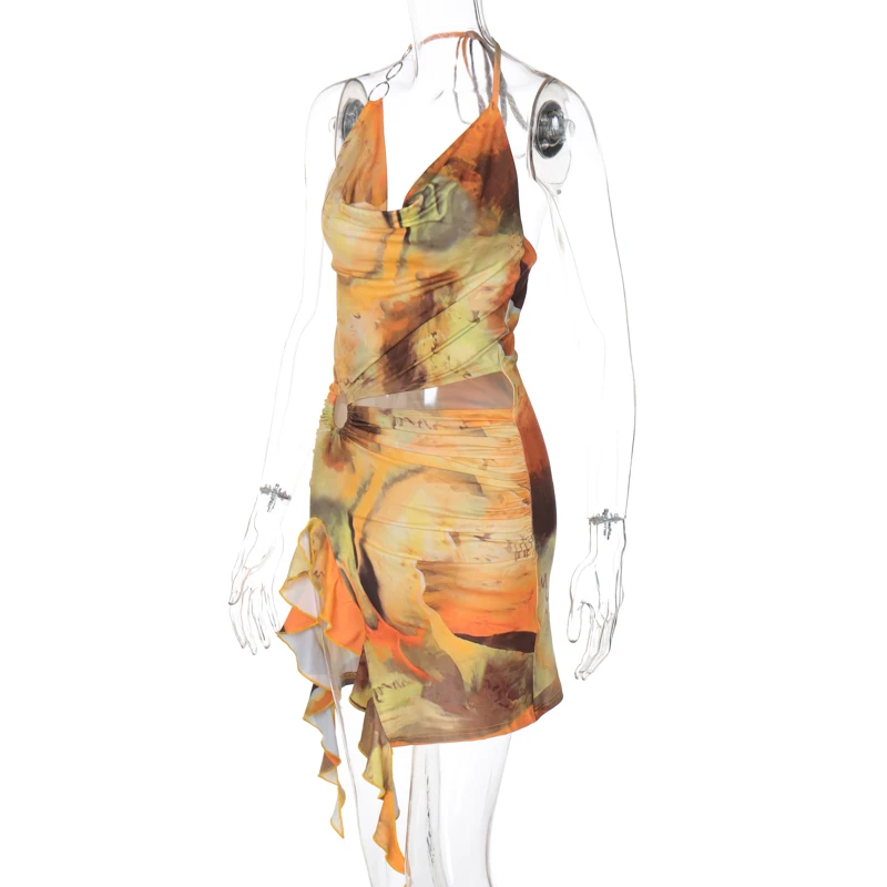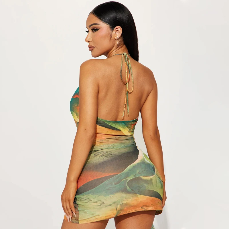 Lunivop Bohemian Tie Dye Print Halter Hollow Out Tassel Backless Short Dress Sumemr Casual Clotehs Vacation Beachwear Streetwear