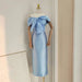 Lunivop Bow Solid Color Luxury Dresses For Women Elegant Short Sleeve High Split Zipper Slim Dress Female 2025 New Clothing