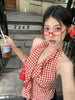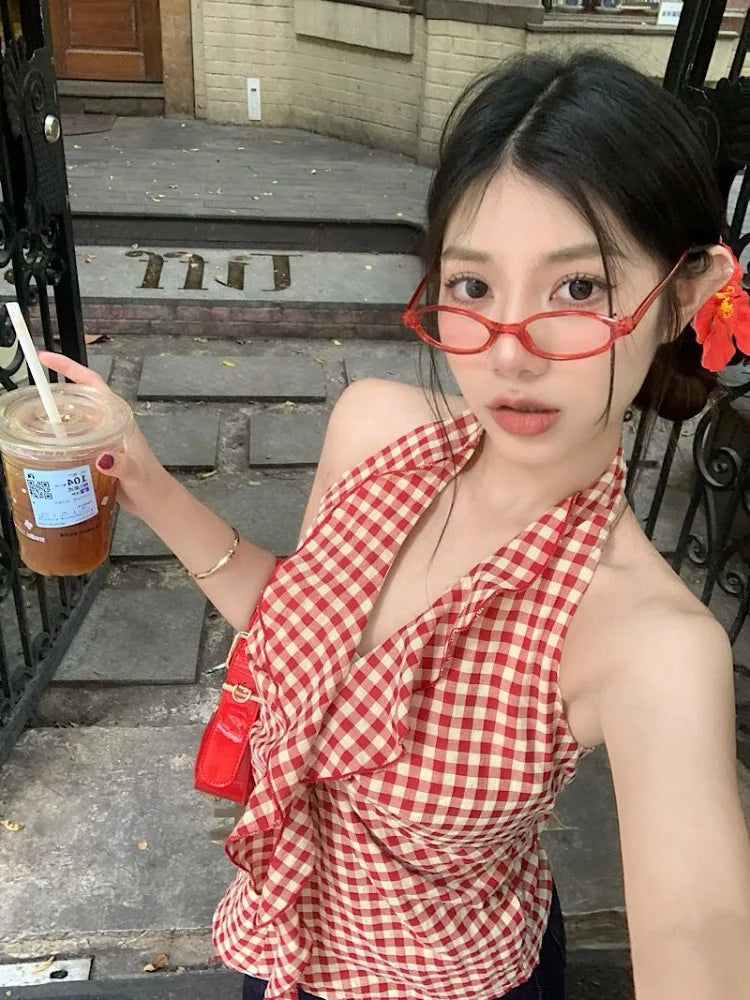 Lunivop Camis Women Plaid Sleeveless Halter Ruffles Bandage Backless Slim Vintage Sweet Casual Sexy Tank Tops Female Summer