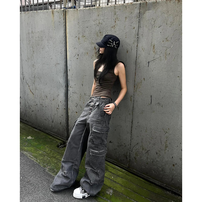 Lunivop Cargo Pants Women Jeans Vintage Street Distressed Wash Baggy Jeans Women Clothing Casual Wide Leg High Waisted Jeans Woman Pants