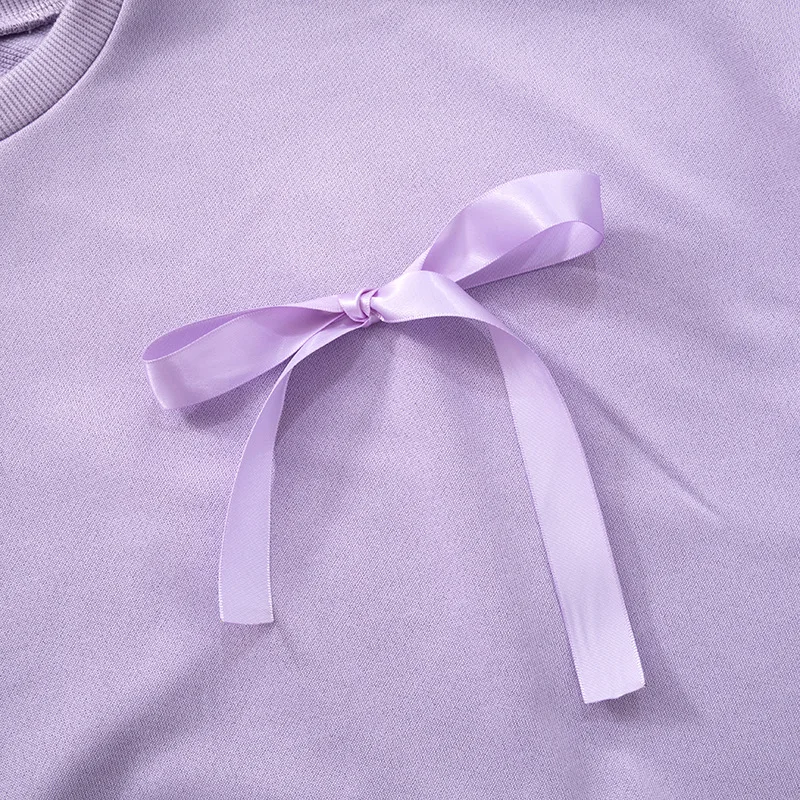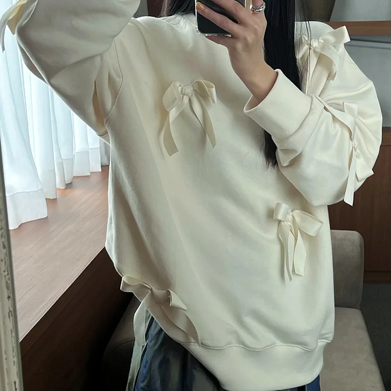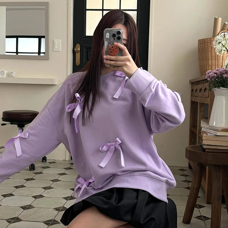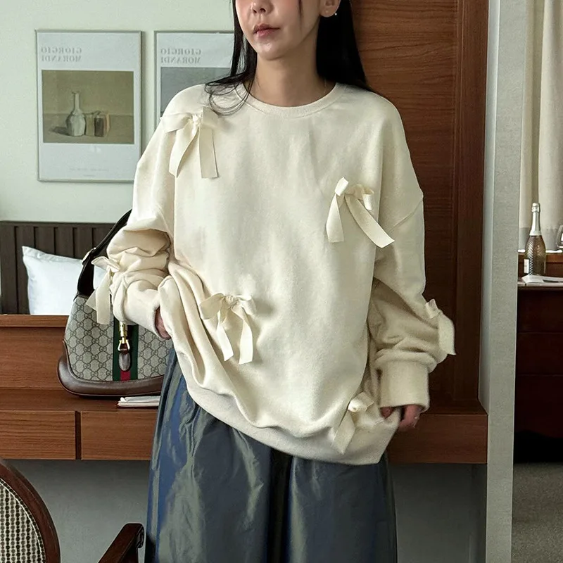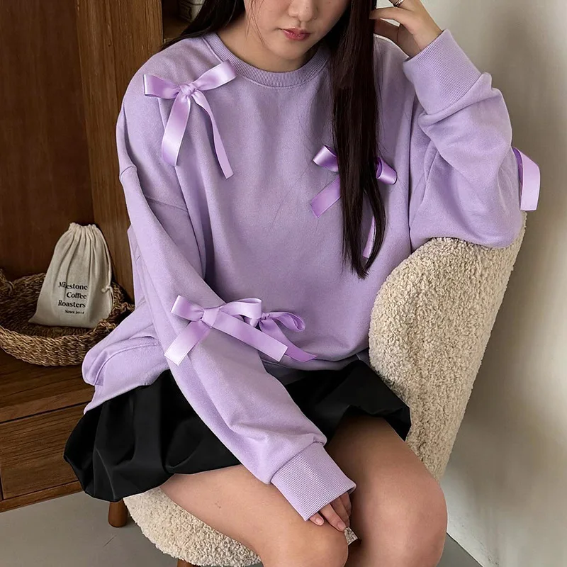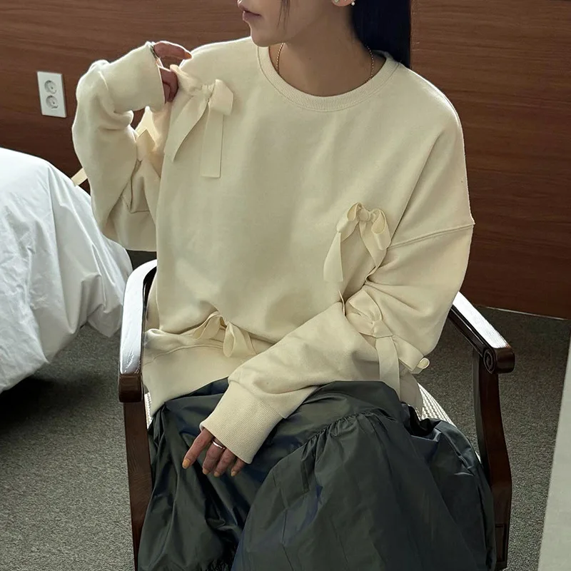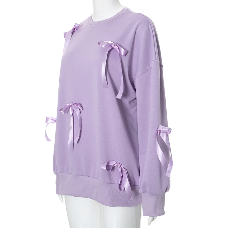 Lunivop Casual Bows Patchwork Sweatshirts Women's Loose Long Sleeve Fashion O Neck Top Solid Pullover Autunmn Winter