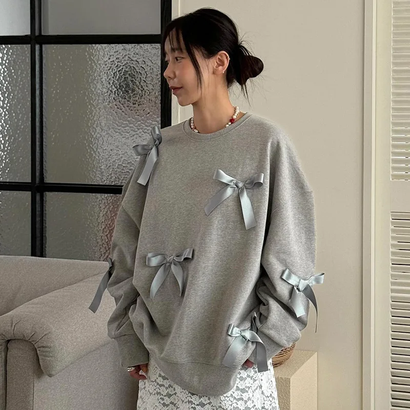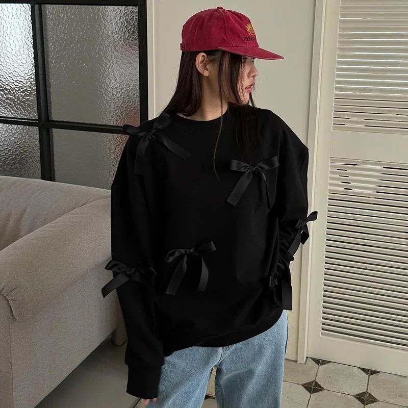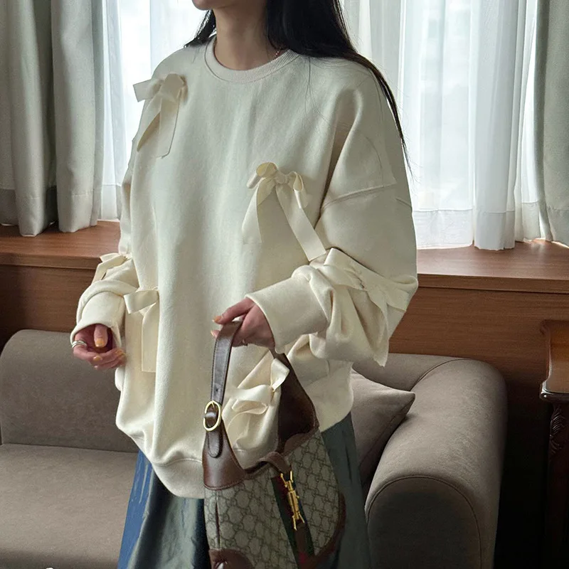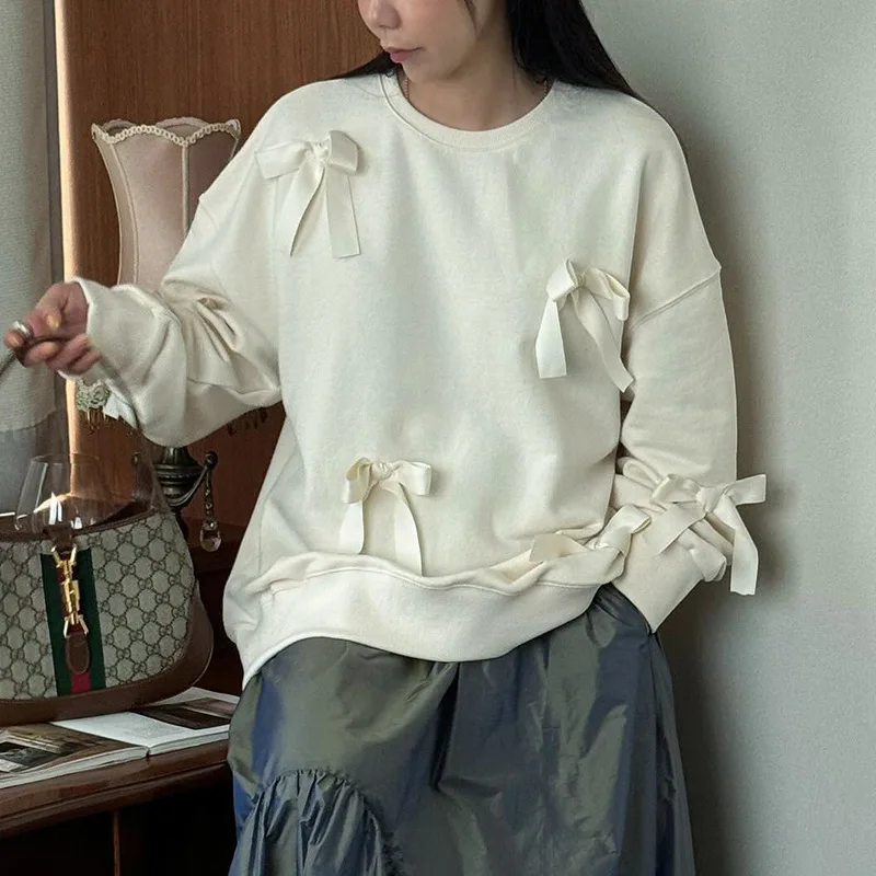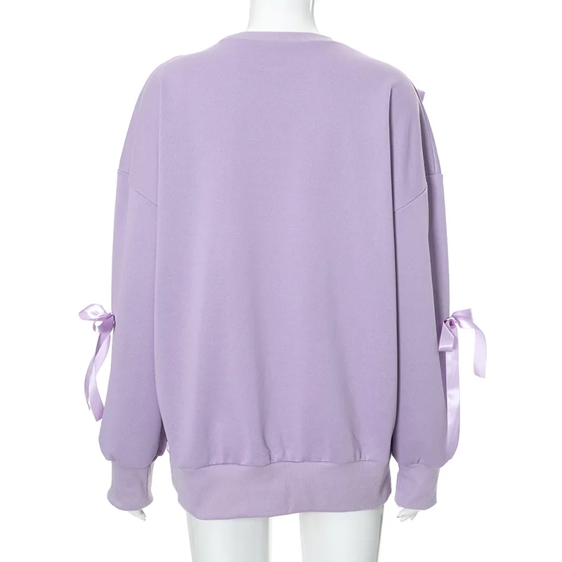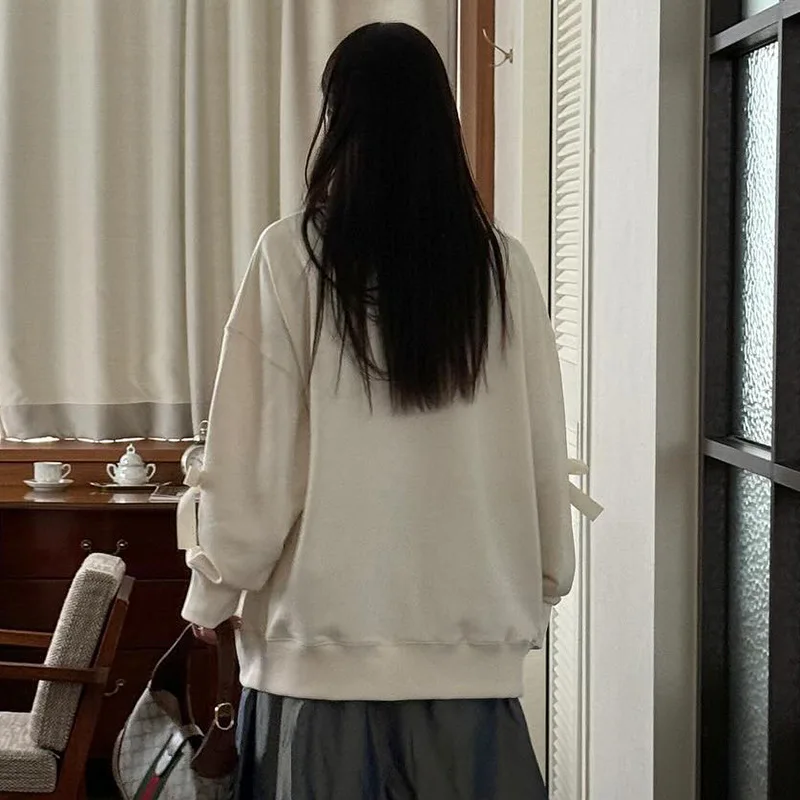 Lunivop Casual Bows Patchwork Sweatshirts Women's Loose Long Sleeve Fashion O Neck Top Solid Pullover Autunmn Winter