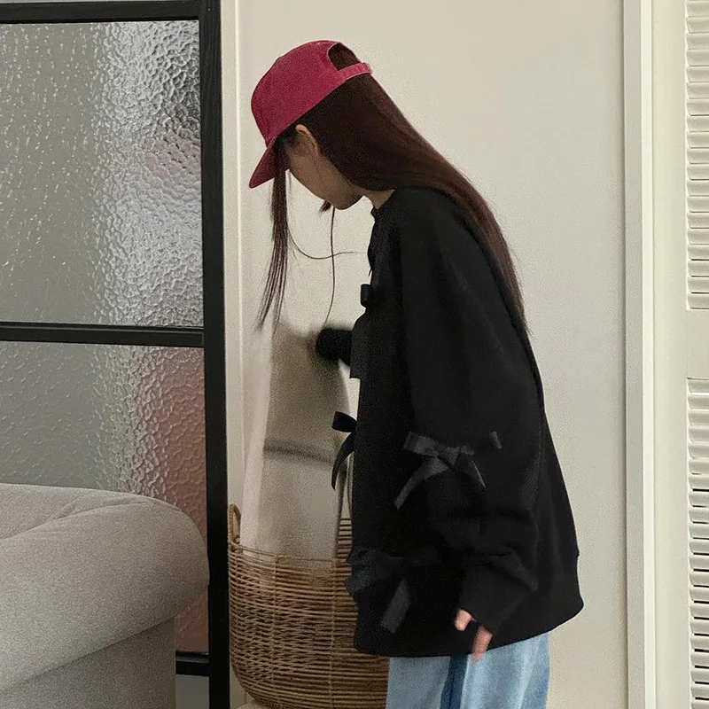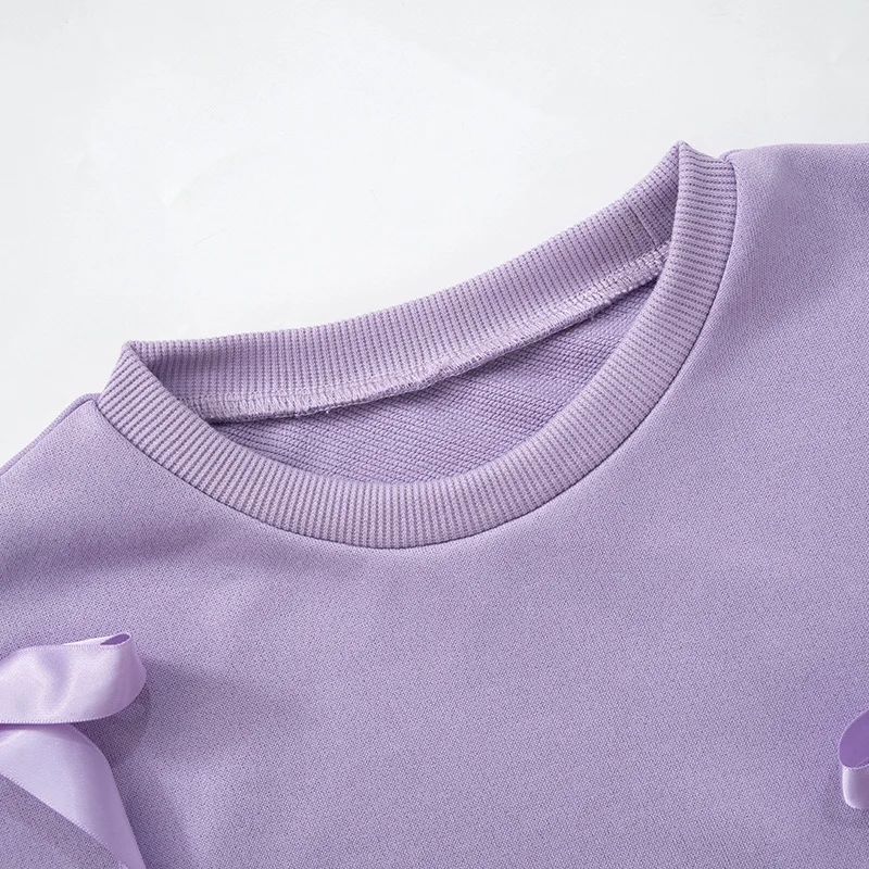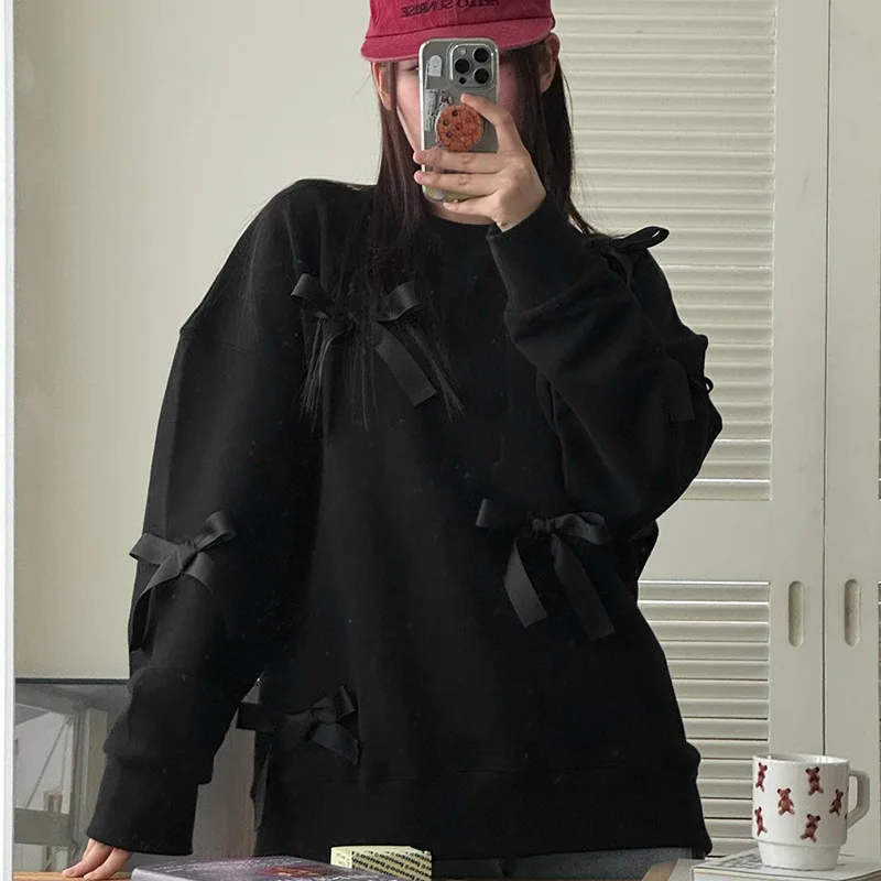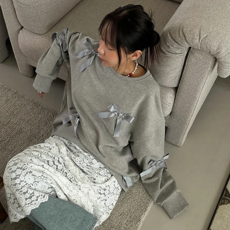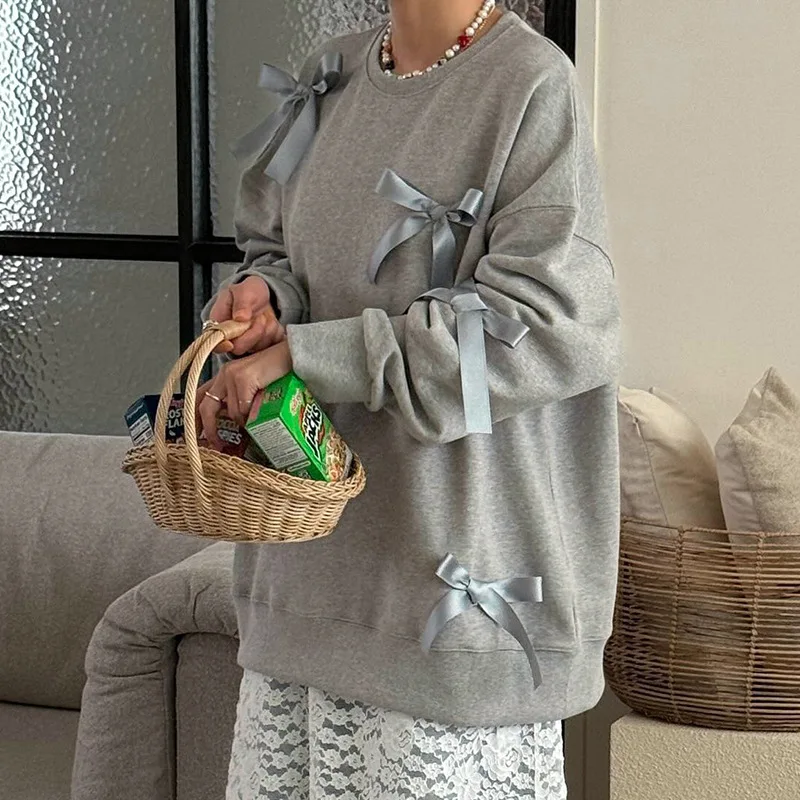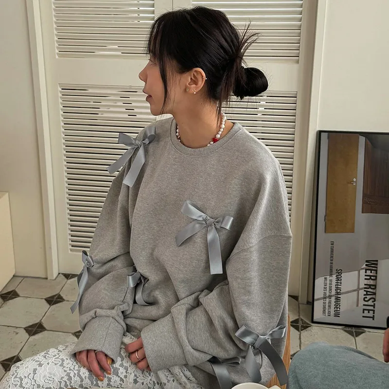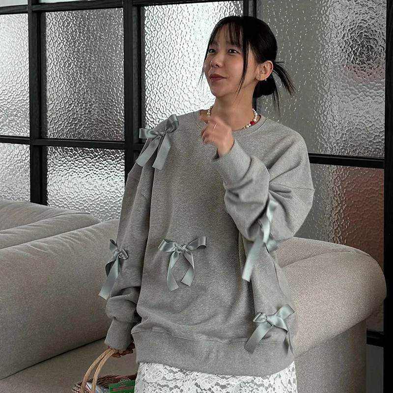 Lunivop Casual Bows Patchwork Sweatshirts Women's Loose Long Sleeve Fashion O Neck Top Solid Pullover Autunmn Winter