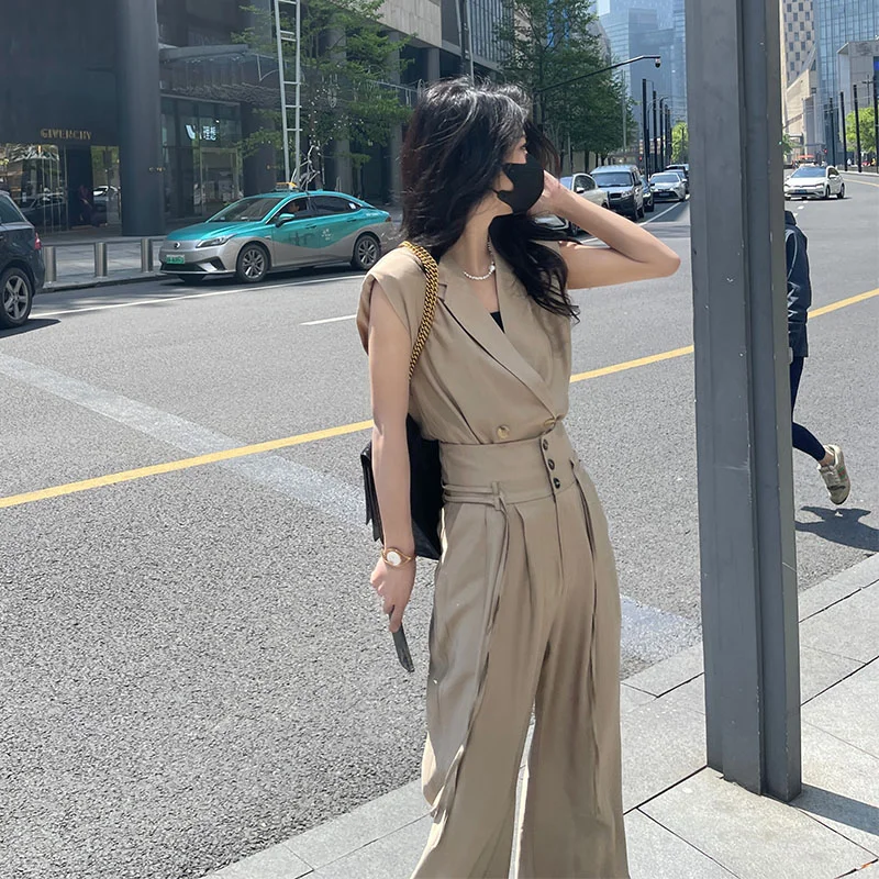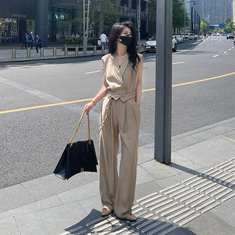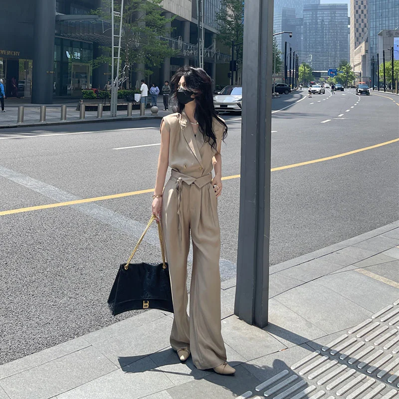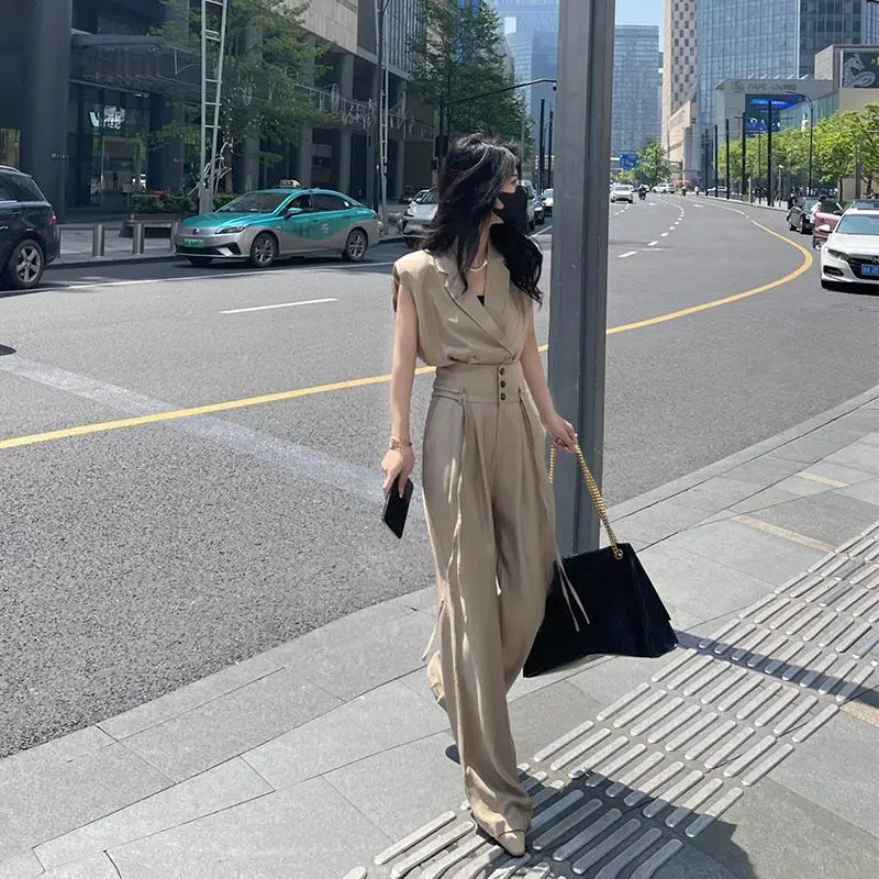 Lunivop Casual Fashion Summer Sleeveless Drawstring Sports Top + High Waist Wide Leg Pants Set Female High Street Office Wear Ladies