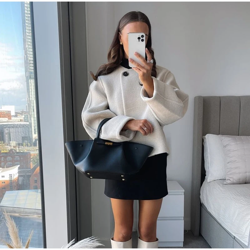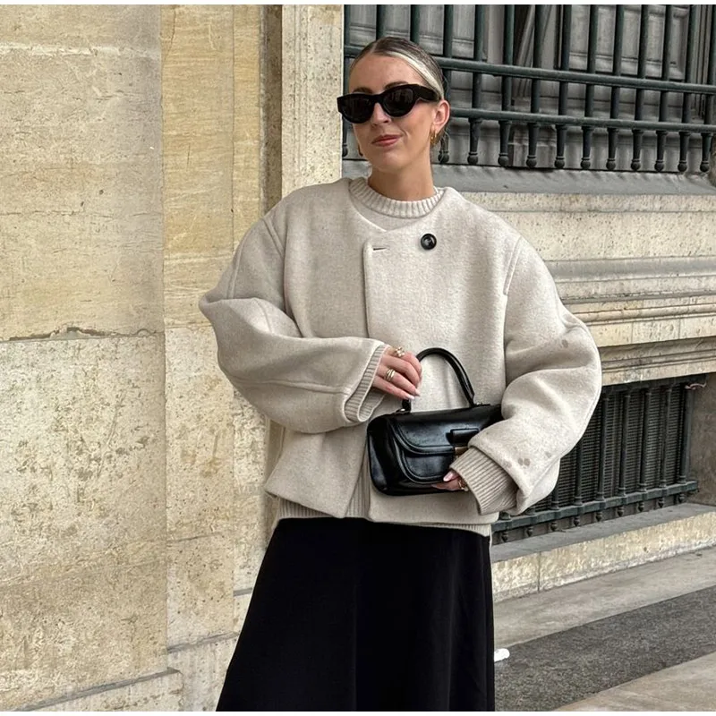 Lunivop Casual Single Button Women's Short Coats Elegant Solid O-neck Long Sleeved Jackets Female Autumn Warm Loose Commute Outwear Tops