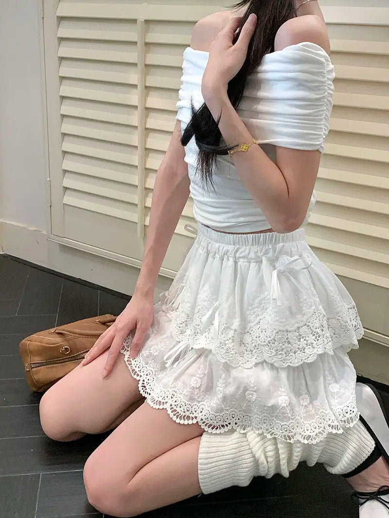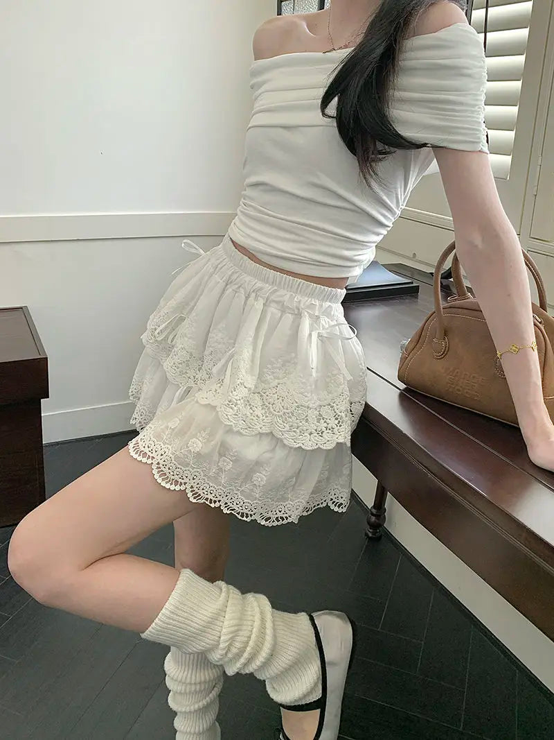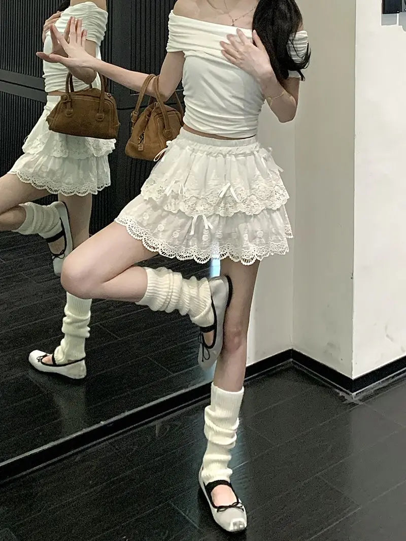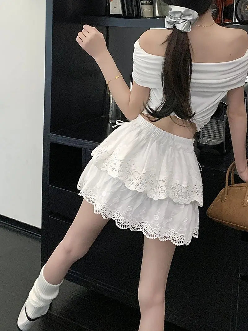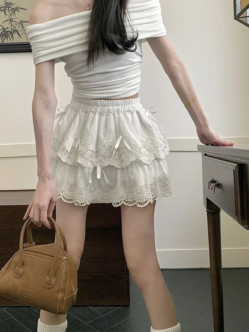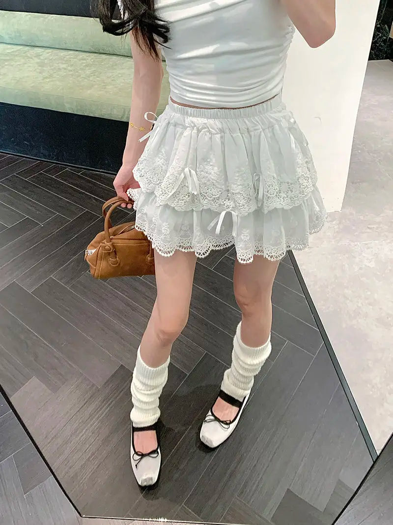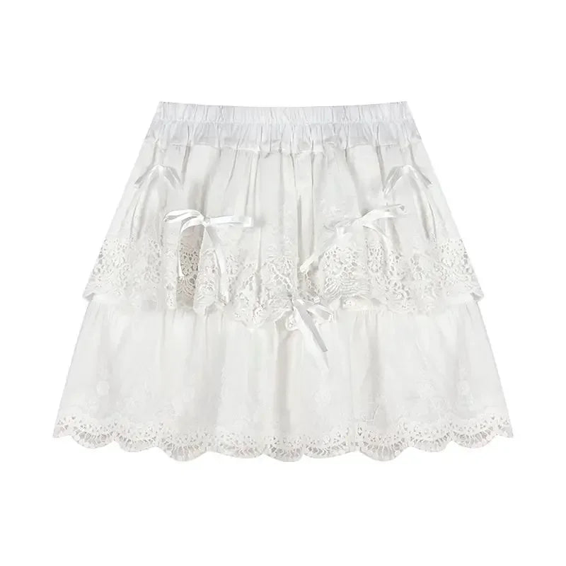 Lunivop Coquette White Lace Short Skirt Ruffle Women Sweet Bow Kawaii Mini Skirts Patchwork Layered A-line Aesthetics Skirt