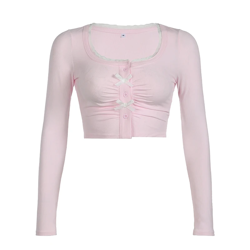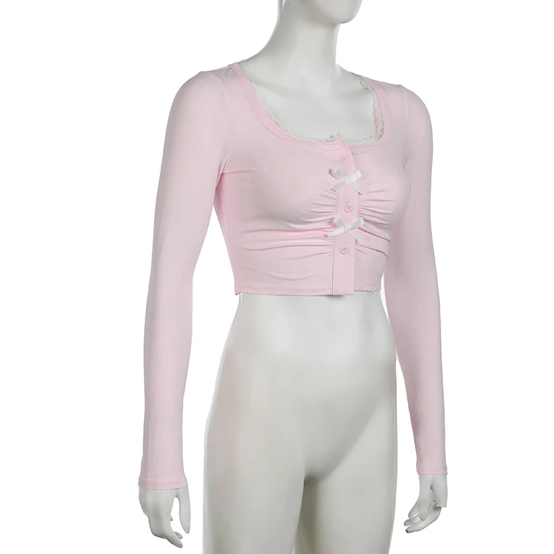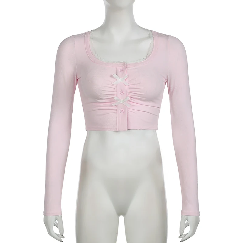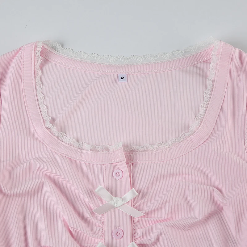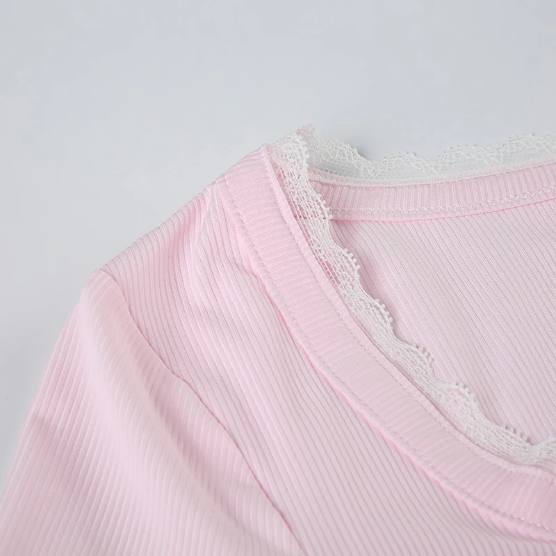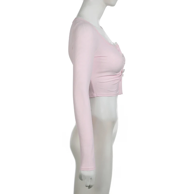 Lunivop Cute Bow Stitching Pink Top Lace Patchwork Square Collar Long Sleeve T-shirts Chic Folds Skinny Basic Tee Women 2024 Fall