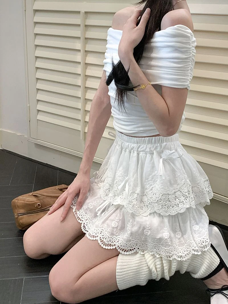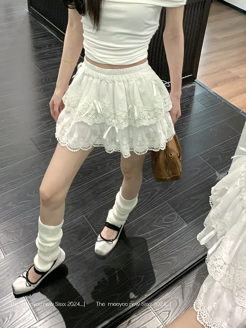 Lunivop Cute Bow White Skirts Women Sweet High Waist Lace Patchwork Mini Skirt Korean Fashion Preppy Style Lady Elegant Cake Skirts