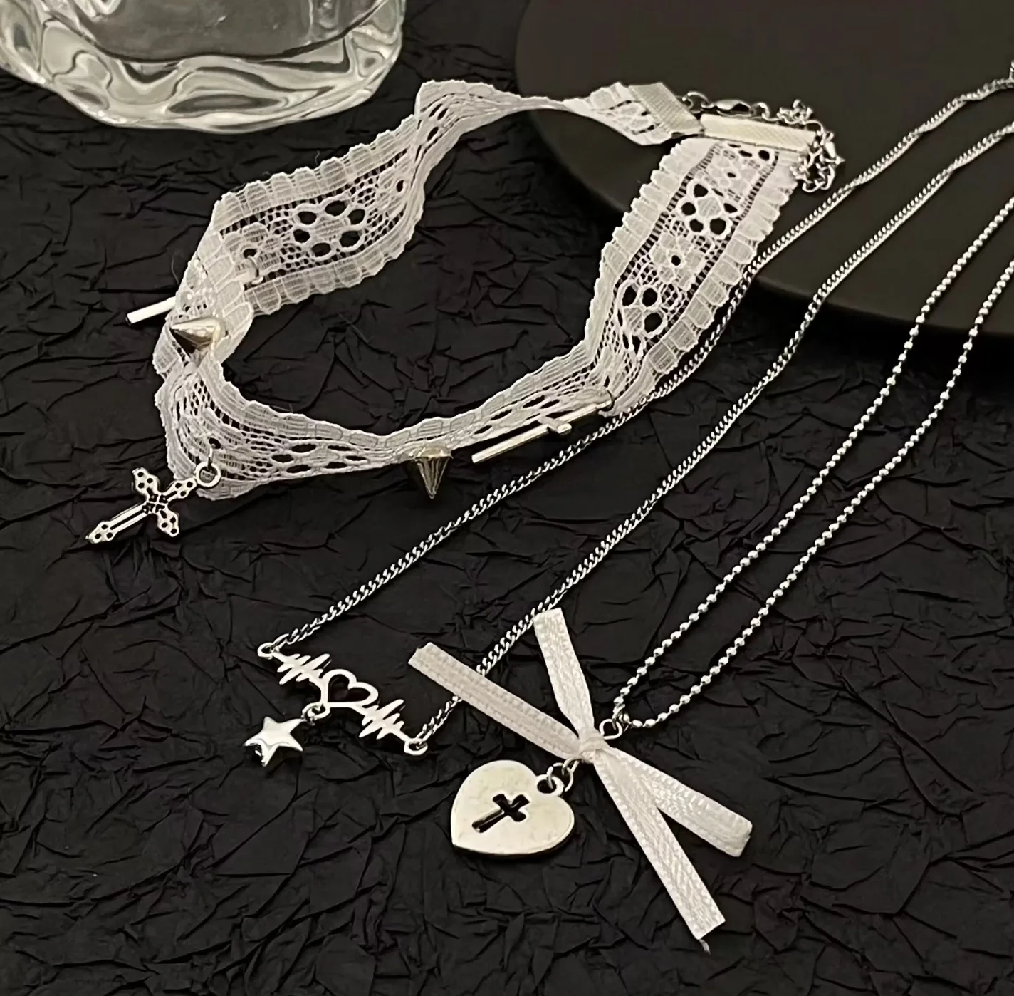 Lunivop Cute Sweet Cool White Lace Heart Cross Multi Layer Choker Necklace for Women Girls Punk Gothic Clavicle Chain Jewelry Party Gift