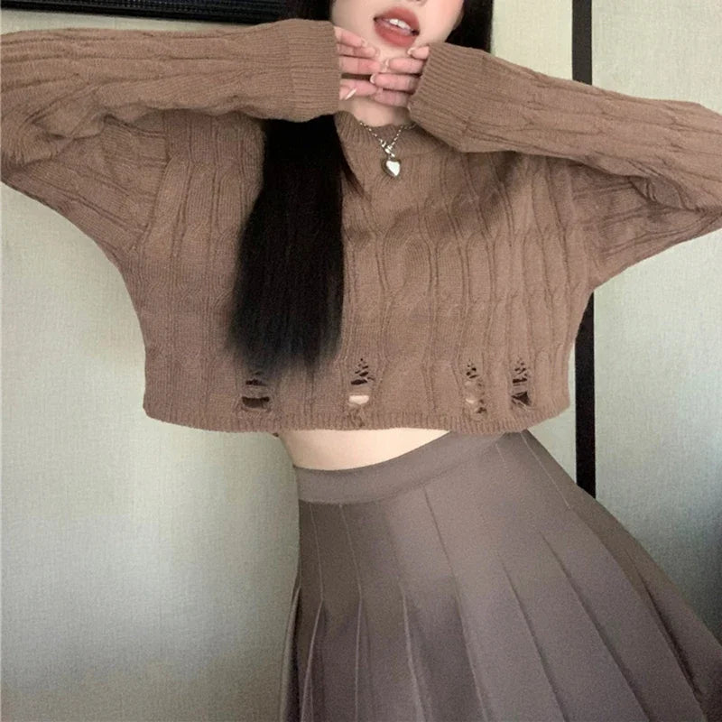 Lunivop Distressed Sweater for Women Teen-girl Cable Knit Crew Neck Crop Sweater Pullover Plain Jumper Y2K Grunge Outfit