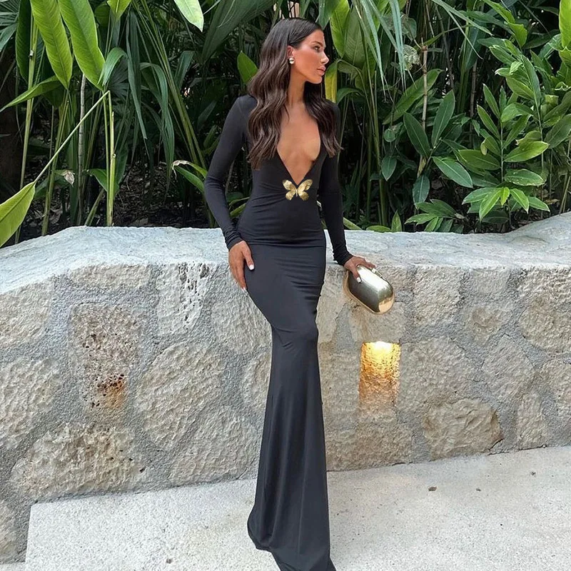 Lunivop Elegant Deep V Neck Metal Butterfly Sexy Mermaid Dress Maxi Evening Dress For Women Long Sleeve Slim Fit High Waist Dress