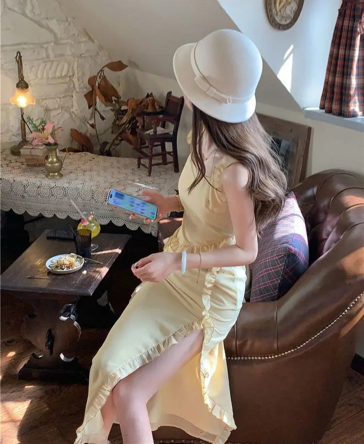 Lunivop Elegant Dresses Women Sleeveless Ruffles Patchwork Split Bandage Summer Fashion Sweet Female Dress Holiday Casual