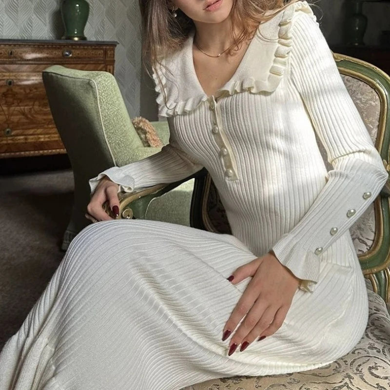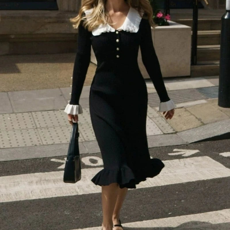 Lunivop Elegant Knitted Long Skirt Women Black Vintage Long Sleeve Party Dresses Sweet Ruffle Patchwork Sweater Maxi Dress Slim